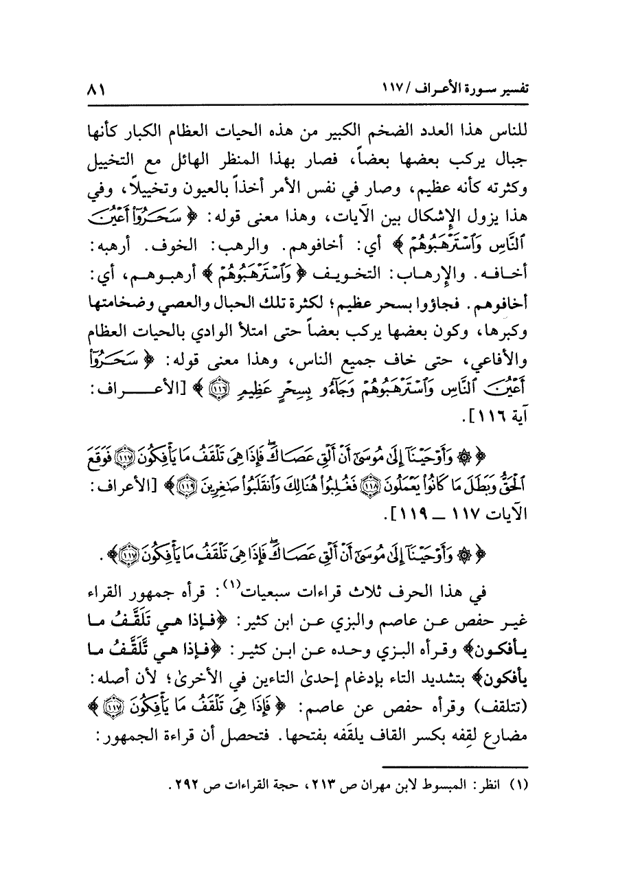 في هذا الحرف ثلاث قراءات سبعيات (¬١): قرأه جمهور القراء غير حفص عن عاصم والبزي عن ابن كثير: {فإذا هي تَلَقَّفُ ما يأفكون} وقرأه البزي وحده عن ابن كثير: {فإذا هي تَّلَقَّفُ ما يأفكون} بتشديد التاء بإدغام إحدى التاءين في الأخرى؛ لأن أصله: (تتلقف) وقرأه حفص عن عاصم: {فَإِذَا هِيَ تَلْقَفُ مَا يَأْفِكُونَ} مضارع لقِفه بكسر القاف يلقَفه بفتحها. فَتَحَصَّل أن قراءة الجمهور: