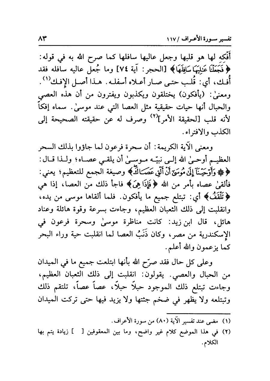 أَفْكِهِ لها هو قلبها وجعل عاليها سافلها كما صرح الله به في قوله: {فَجَعَلْنَا عَالِيَهَا سَافِلَهَا} [الحجر: آية ٧٤] وما جُعل عاليه سافله فقد أُفك، أي: قُلب حتى صار أعلاه أسفله. هذا أصل الإفك (¬١). ومعنى: (يأفكون) يختلقون ويكذبون ويفترون من أن هذه العصي والحبال أنها حيات حقيقية مثل العصا التي عند موسى. سماه إفكًا لأنه قلب [لحقيقة الأمر] (¬٢) وصرف له عن حقيقته الصحيحة إلى الكذب والافتراء.