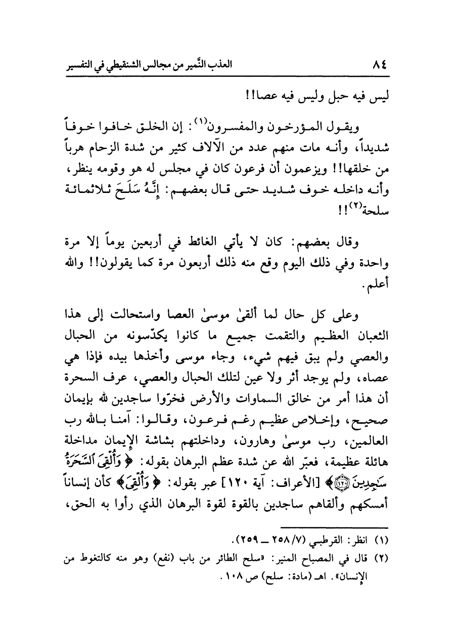 ليس فيه حبل وليس فيه عصا!! ويقول المؤرخون والمفسرون (¬١): إن الخلق خافوا خوفًا شديدًا، وأنه مات منهم عدد من الآلاف كثير من شدة الزحام هربًا من خلقها!! ويزعمون أن فرعون كان في مجلس له هو وقومه ينظر، وأنه داخله خوف شديد حتى قال بعضهم: إِنَّهُ سَلَحَ ثلاثمائة سلحة (¬٢)!!