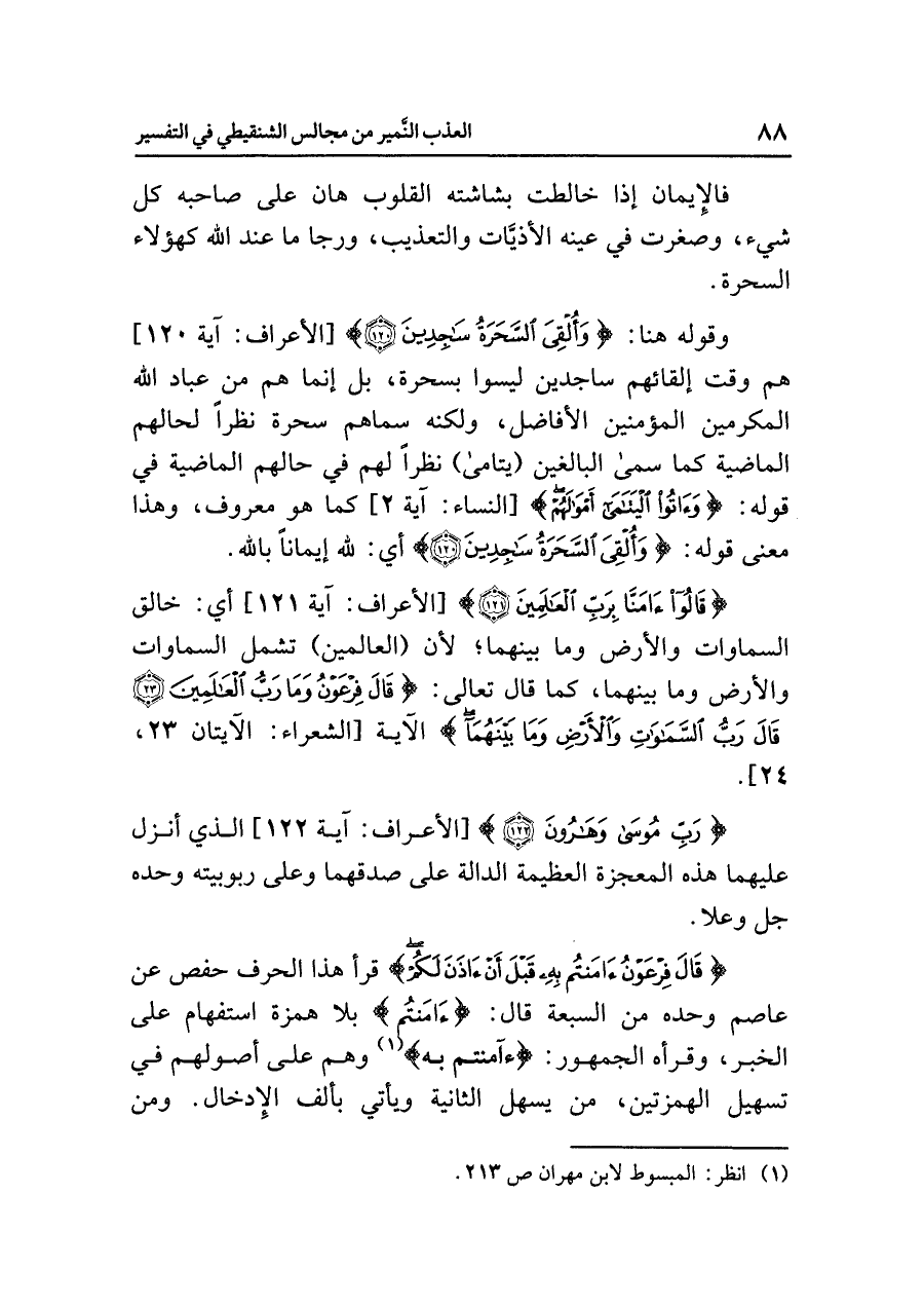 {قَالَ فِرْعَوْنُ آمَنتُم بِهِ قَبْلَ أَن آذَنَ لَكُمْ} قرأ هذا الحرف حفص عن عاصم وحده من السبعة قال: {ءامَنتُم} بلا همزة استفهام على الخبر، وقرأه الجمهور: {ءآمَنتُم به} (¬١) وهم على أصولهم في تسهيل الهمزتين، من يسهل الثانية ويأتي بألف الإدخال، ومن