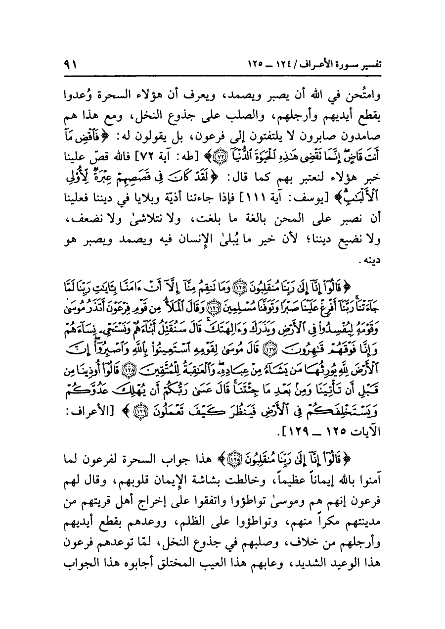 {قَالُواْ إِنَّا إِلَى رَبِّنَا مُنقَلِبُونَ (١٢٥)} هذا جواب السحرة لفرعون لما آمنوا بالله إيمانًا عظيمًا، وخالطت بشاشة الإيمان قلوبهم، وقال لهم فرعون إنهم هم وموسى تواطئوا واتفقوا على إخراج أهل قريتهم من مدينتهم مكرًا منهم، وتواطئوا على الظلم، ووعدهم بقطع أيديهم وأرجلهم من خلاف، وصلبهم في جذوع النخل، لمّا توعدهم فرعون هذا الوعيد الشديد، وعابهم هذا العيب المختلق أجابوه هذا الجواب