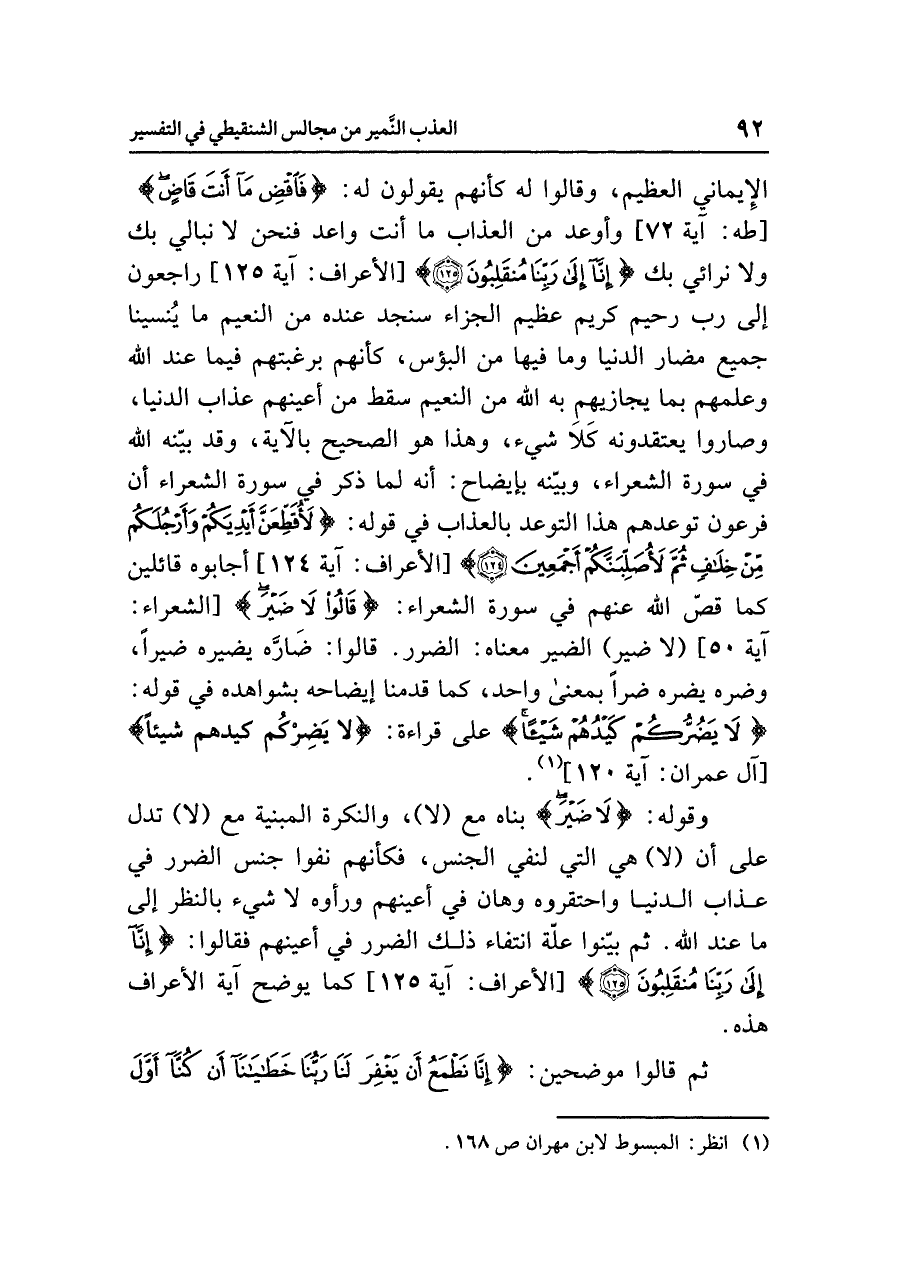 الإيماني العظيم، وقالوا له كأنهم يقولون له: {فَاقْضِ مَا أَنتَ قَاضٍ} [طه: آية ٧٢] وأوعد من العذاب ما أنت واعد فنحن لا نبالي بك ولا نرائي بك {إِنَّا إِلَى رَبِّنَا مُنقَلِبُونَ} [الأعراف: آية ١٢٥] راجعون إلى رب رحيم كريم عظيم الجزاء سنجد عنده من النعيم ما يُنسينا جميع مضار الدنيا وما فيها من البؤس، كأنهم برغبتهم فيما عند الله وعلمهم بما يجازيهم به الله من النعيم سقط من أعينهم عذاب الدنيا، وصاروا يعتقدونه كَلَا شيء، وهذا هو الصحيح بالآية، وقد بيّنه الله في سورة الشعراء، وبيّنه بإيضاح: أنه لما ذكر في سورة الشعراء أن فرعون توعدهم هذا التوعد بالعذاب في قوله: {لأُقَطِّعَنَّ أَيْدِيَكُمْ وَأَرْجُلَكُم مِّنْ خِلَافٍ ثُمَّ لأُصَلِّبَنَّكُمْ أَجْمَعِينَ (١٢٤)} [الأعراف: آية ١٢٤] أجابوه قائلين كما قصّ الله عنهم في سورة الشعراء: {قَالُوا لَا ضَيْرَ} [الشعراء: آية ٥٠] (لا ضير) الضير معناه: الضرر. قالوا: ضَارَّه يضيره ضيرًا، وضره يضره ضرًّا بمعنى واحد، كما قدمنا إيضاحه بشواهده في قوله: {لَا يَضُرُّكُمْ كَيْدُهُمْ شيئًا} على قراءة: {لا يَضِرْكُم كيدهم شيئًا} [آل عمران: آية ١٢٠] (¬١).
