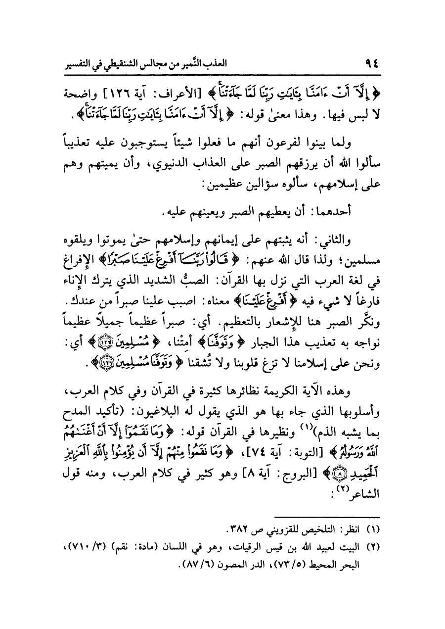 {إِلَاّ أَنْ آمَنَّا بِآيَاتِ رَبِّنَا لَمَّا جَاءتْنَا} [الأعراف: ١٢٦] واضحة لا لبس فيها. وهذا معنى قوله: {إِلَاّ أَنْ آمَنَّا بِآيَاتِ رَبِّنَا لَمَّا جَاءتْنَا}.