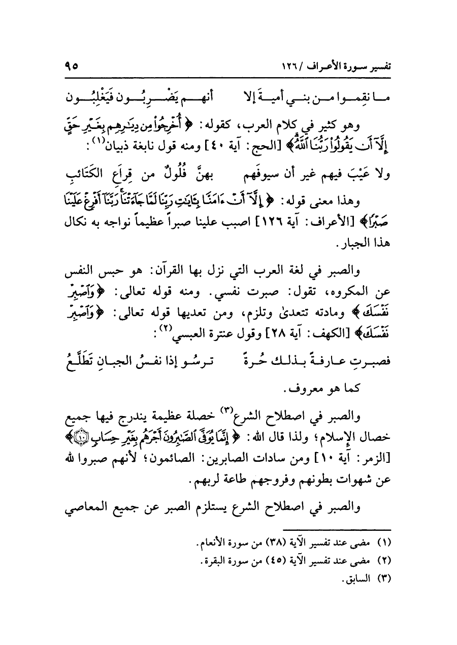 والصبر في لغة العرب التي نزل بها القرآن: هو حبس النفس عن المكروه، تقول: صبرت نفسي. ومنه قوله تعالى: {وَاصْبِرْ نَفْسَكَ} ومادته تتعدى وتلزم، ومن تعديها قوله تعالى: {وَاصْبِرْ نَفْسَكَ} [الكهف: آية ٢٨] وقول عنترة العبسي (¬٢):