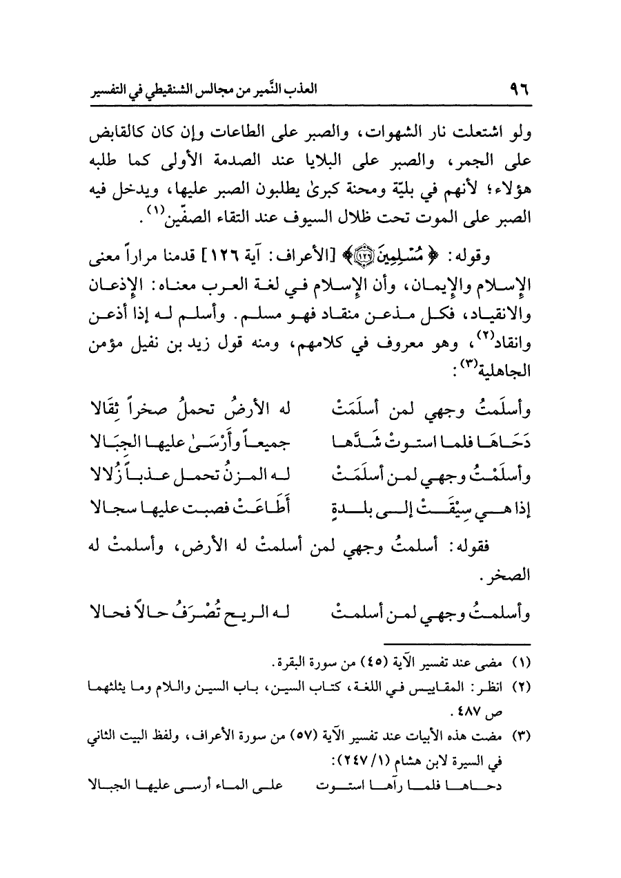 وقوله: {مُسْلِمِينَ} [الأعراف: آية ١٢٦] قدمنا مرارًا معنى الإسلام والإيمان، وأن الإسلام في لغة العرب معناه: الإذعان والانقياد، فكل مذعن منقاد فهو مسلم. وأسلم له إذا أذعن وانقاد (¬٢)، وهو معروف في كلامهم، ومنه قول زيد بن نفيل مؤمن الجاهلية (¬٣):