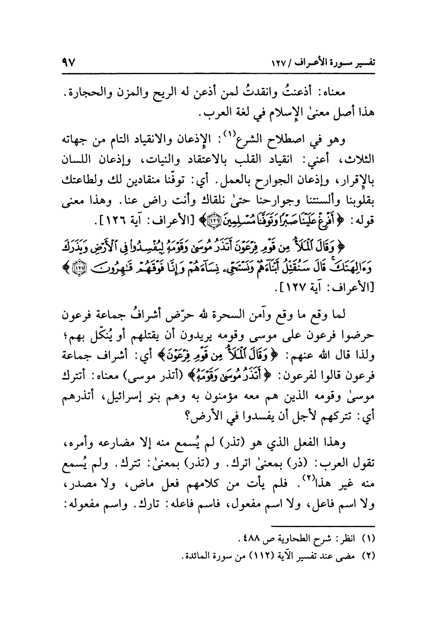 وهو في اصطلاح الشرع (¬١): الإذعان والانقياد التام من جهاته الثلاث، أعني: انقياد القلب بالاعتقاد والنيات، وإذعان اللسان بالإقرار، وإذعان الجوارح بالعمل. أي: توفَّنا منقادين لك ولطاعتك بقلوبنا وألسنتنا وجوارحنا حتى نلقاك وأنت راض عنا. وهذا معنى قوله: {أَفْرِغْ عَلَيْنَا صَبْرًا وَتَوَفَّنَا مُسْلِمِينَ} [الأعراف: آية ١٢٦].