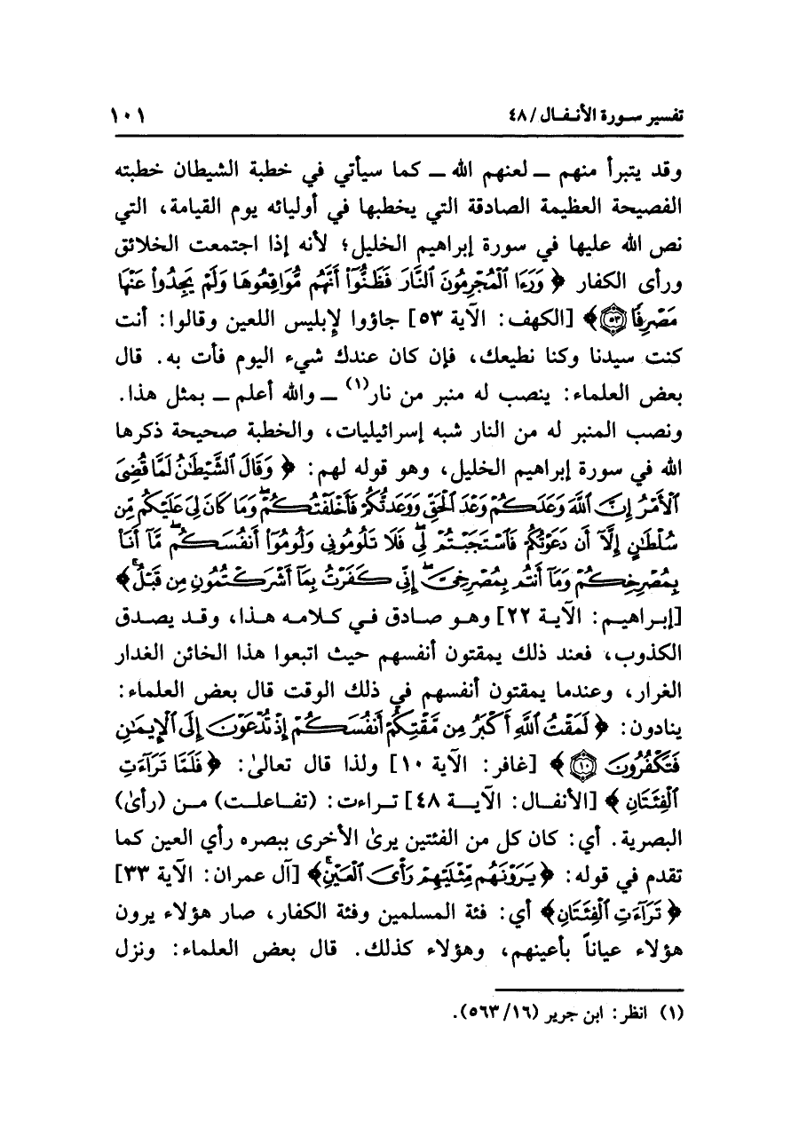 ونصب المنبر له من النار شبه إسرائيليات، والخطبة صحيحة ذكرها الله في سورة إبراهيم الخليل، وهو قوله لهم: {وَقَالَ الشَّيْطَانُ لَمَّا قُضِيَ الأَمْرُ إِنَّ اللَّهَ وَعَدَكُمْ وَعْدَ الْحَقِّ وَوَعَدتُّكُمْ فَأَخْلَفْتُكُمْ وَمَا كَانَ لِيَ عَلَيْكُم مِّن سُلْطَانٍ إِلَاّ أَن دَعَوْتُكُمْ فَاسْتَجَبْتُمْ لِي فَلَا تَلُومُونِي وَلُومُواْ أَنفُسَكُم مَّا أَنَا بِمُصْرِخِكُمْ وَمَا أَنتُمْ بِمُصْرِخِيَّ إِنِّي كَفَرْتُ بِمَا أَشْرَكْتُمُونِ مِن قَبْلُ} [إبراهيم: الآية ٢٢] وهو صادق في كلامه هذا، وقد يصدق الكذوب، فعند ذلك يمقتون أنفسهم حيث اتبعوا هذا الخائن الغدار الغَرَّار، وعندما يمقتون أنفسهم في ذلك الوقت قال بعض العلماء: ينادون: {لَمَقْتُ اللَّهِ أَكْبَرُ مِن مَّقْتِكُمْ أَنفُسَكُمْ إِذْ تُدْعَوْنَ إِلَى الإِيمَانِ فَتَكْفُرُونَ} [غافر: الآية ١٠] ولذا قال تعالى: {فَلَمَّا تَرَاءتِ الْفِئَتَانِ} [الأنفال: الآية ٤٨] تراءت: (تَفَاعَلَتْ) من (رأى) البصرية. أي: كان كل من الفئتين يرى الأخرى ببصره رأي العين كما تقدم في قوله: {يَرَوْنَهُم مِّثْلَيْهِمْ رَأْيَ الْعَيْنِ} [آل عمران: الآية ٣٣] {تَرَاءتِ الْفِئَتَانِ} أي: فئة المسلمين وفئة الكفار، صار هؤلاء يرون هؤلاء عياناً بأعينهم، وهؤلاء كذلك. قال بعض العلماء: ونزل
