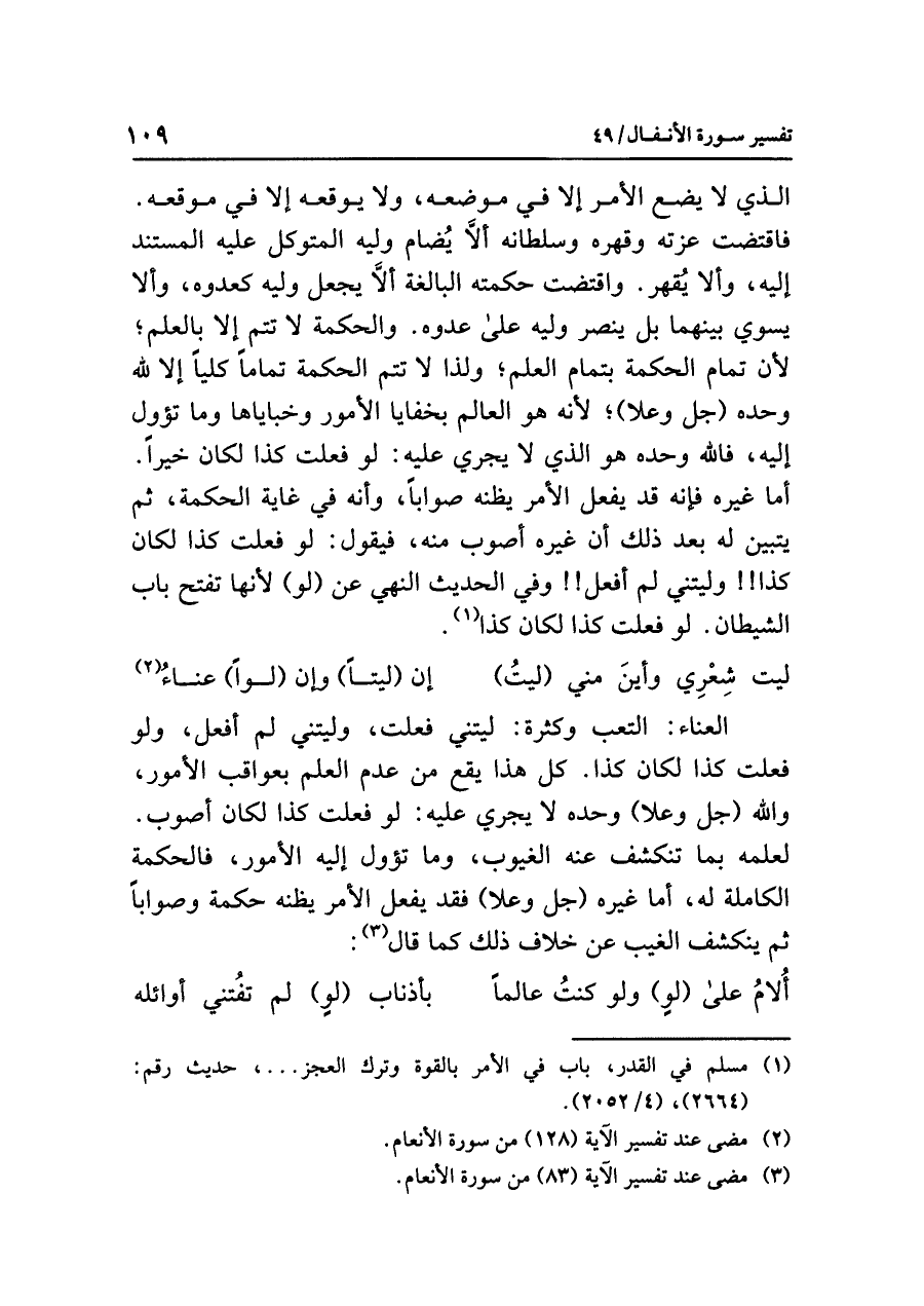 العناء: التعب وكثرة: ليتني فعلت، وليتني لم أفعل، ولو فعلت كذا لكان كذا. كل هذا يقع من عدم العلم بعواقب الأمور، والله (جل وعلا) وحده لا يجري عليه: لو فعلت كذا لكان أصوب. لعلمه بما تنكشف عنه الغيوب، وما تؤول إليه الأمور، فالحكمة الكاملة له، أما غيره (جل وعلا) فقد يفعل الأمر يظنّه حكمة وصواباً ثم يَنْكَشِفُ الغَيْبُ عَنْ خلاف ذلك كما قال (¬٣):