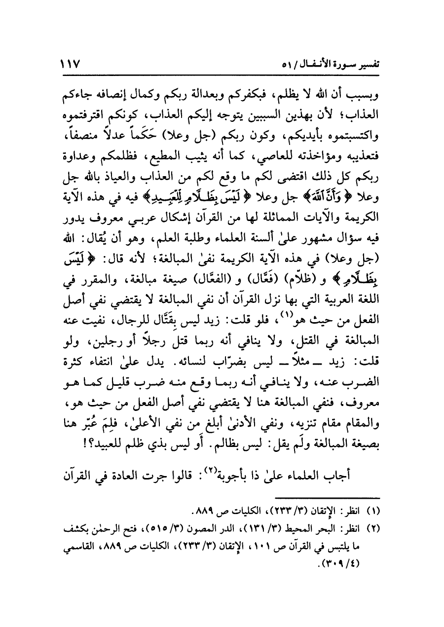 وبسبب أن الله لا يَظْلِم، فبِكُفْرِكُمْ وبِعَدَالَةِ رَبِّكُمْ وكَمَالِ إِنْصَافِهِ جاءكم العذاب؛ لأن بهذين السببين يتوجه إليكم العذاب، كونكم اقترفتموه واكْتَسَبْتُمُوهُ بأيديكم، وكون ربكم (جل وعلا) حكماً عدلاً منصفاً، فتعذيبه ومؤاخذته للعاصي، كما أنه يثيب المطيع، فظلمكم وعداوة ربكم كل ذلك اقتضى لكم ما وقع لكم من العذاب والعياذ بالله جل وعلا {وَأَنَّ اللَّهَ} جل وعلا {لَيْسَ بِظَلَاّمٍ لِّلْعَبِيدِ} فيه في هذه الآية الكريمة والآيات المماثلة لها من القرآن إشكال عربي معروف يدور فيه سؤال مشهور على ألسنة العلماء وطلبة العلم، وهو أن يُقال: الله (جل وعلا) في هذه الآية الكريمة نفى المبالغة؛ لأنه قال: {لَيْسَ بِظَلَاّمٍ} و (ظلاّم) (فَعَّال) و (الفعَّال) صيغة مبالغة، والمقرر في اللغة العربية التي بها نزل القرآن أن نفي المبالغة لا يقتضي نفي أَصْلِ الفِعْلِ من حيث هو (¬١)، فلو قلت: زيد ليس بقَتَّال للرجال، نفيت عنه المبالغة في القتل، ولا ينافي أنه ربما قتل رجلاً أو رجلين، ولو قلت: زيد -مثلاً- ليس بضرّاب لنسائه. يدل على انتفاء كثرة الضرب عنه، ولا ينافي أنه ربما وقع منه ضرب قليل كما هو معروف، فنفي المبالغة هنا لا يقتضي نفي أصل الفعل من حيث هو، والمقام مقام تنْزِيه، ونفي الأدنى أبلغ مِنْ نَفْيِ الأَعْلَى، فلِمَ عُبّر هنا بصيغة المبالغة ولَم يقل: ليس بظالم. أَو ليس بذي ظلم للعبيد؟!