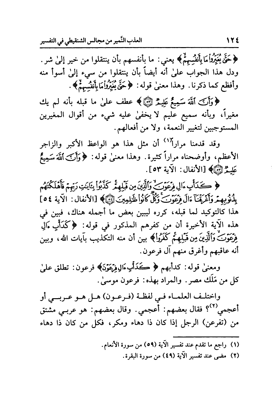 {كَدَأْبِ آلِ فِرْعَوْنَ وَالَّذِينَ مِن قَبْلِهِمْ كَذَّبُواْ بآيَاتِ رَبِّهِمْ فَأَهْلَكْنَاهُم بِذُنُوبِهِمْ وَأَغْرَقْنَا آلَ فِرْعَونَ وَكُلٌّ كَانُواْ ظَالِمِينَ (٥٤)} [الأنفال: الآية ٥٤] هذا كالتوكيد لما قبله، كرره ليبين بعض ما أجمله هناك، فبين في هذه الآية الأخيرة أن مِنْ كفرهم المذكور في قوله: {كَدَأْبِ آلِ فِرْعَوْنَ وَالَّذِينَ مِن قَبْلِهِمْ كَفَرُواْ} بَيَّنَ أنَّ مِنْهُ التكذيب بآيات الله، وبين أنه عاقبهم وأغرق منهم آل فرعون.