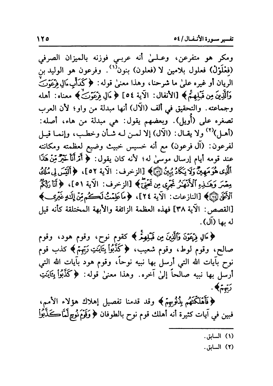 ومكر هو متفَرْعِن، وعلى أنه عربي فوزنه بالميزان الصرفي (فِعْلَوْل) فعلول بلامين لا (فعلون) بنون (¬١). وفرعون هو الوليد بن الريان أو غيره على ما شرحنا، وهذا معنى قوله: {كَدَأْبِءَالِ فِرْعَوْنَ وَالَّذِينَ مِن قَبْلِهِمْ} [الأنفال: الآية ٥٤] {ءَالِ فِرْعَوْنَ} معناه: أهله وجماعته. والتحقيق في ألف (الآل) أنها مبدلة من واو؛ لأن العرب تصغره على (أُويل). وبعضهم يقول: هي مبدلة من هاء، أصله: (أهل) (¬٢) ولا يقال: (الآل) إلا لمن له شأن وخطب، وإنما قيل لفرعون: (آل فرعون) مع أنه خسيس خبيث وضيع لعظمته ومكانته عند قومه أيام إرسال موسى له؛ لأنه كان يقول: {أَمْ أَنَا خَيْرٌ مِّنْ هَذَا الَّذِي هُوَ مَهِينٌ وَلَا يَكَادُ يُبِينُ (٥٢)} [الزخرف: الآية ٥٢] {أَلَيْسَ لِي مُلْكُ مِصْرَ وَهَذِهِ الأَنْهَارُ تَجْرِي مِن تَحْتِي} [الزخرف: الآية ٥١] {أَنَا رَبُّكُمُ الأَعْلَى} [النازعات: الآية ٢٤] {مَا عَلِمْتُ لَكُم مِّنْ إِلَهٍ غَيْرِي} [القصص: الآية ٣٨] فهذه العظمة الزائفة والأبهة المختلقة كأنه قيل له بها (آل).