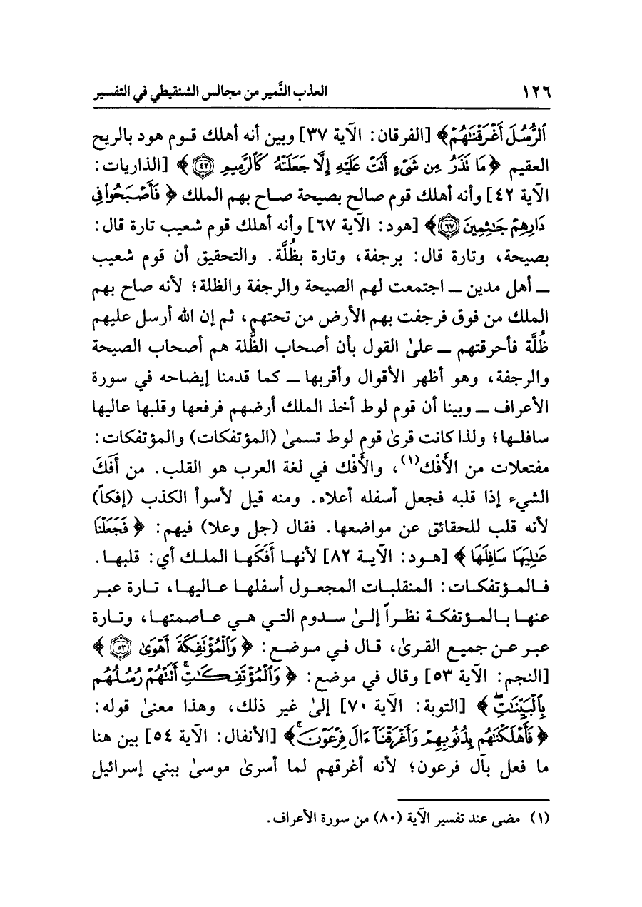 الرُّسُلَ أَغْرَقْنَاهُمْ} [الفرقان: الآية ٣٧] وبين أنه أهلك قوم هود بالريح العقيم {مَا تَذَرُ مِن شَيْءٍ أَتَتْ عَلَيْهِ إِلَاّ جَعَلَتْهُ كَالرَّمِيمِ (٤٢)} [الذاريات: الآية ٤٢] وأنه أهلك قوم صالح بصيحة صاح بهم الملك {فَأَصْبَحُواْ فِي دِيَارِهِمْ جَاثِمِينَ} [هود: الآية ٦٧] وأنه أهلك قوم شعيب تارة قال: بصيحة، وتارة قال: برجفة، وتارة بظُلَّة. والتحقيق أن قوم شعيب -أهل مدين- اجتمعت لهم الصيحة والرجفة والظلة؛ لأنه صاح بهم الملك من فوق فرجفت بهم الأرض مِنْ تَحْتِهِمْ، ثم إن الله أرسل عليهم ظُلَّّة فأحرقتهم - على القول بأن أصحاب الظُّلة هم أصحاب الصيحة والرجفة، وهو أظهر الأقوال وأقربها -كما قدمنا إيضاحه في سورة الأعراف- وبينا أن قوم لوط أخذ المَلَكُ أرْضَهُمْ فَرَفَعَها وقَلَبَهَا عَالِيَهَا سافلها؛ ولذا كانت قرى قوم لوط تسمى (المؤتفكات) والمؤتفكات: مفْتعلات من الأَفْك (¬١)، والأَفْك في لغة العرب هو القلب. من أفَكَ الشَّيْءَ: إذا قَلَبَهُ فجعل أسْفَلَهُ أعْلَاهُ. ومنه قيل لأسوأ الكذب (إفكاً) لأنه قلب للحقائق عن مواضعها. فقال (جل وعلا) فيهم: {فَجَعَلْنَا عَالِيَهَا سَافِلَهَا} [هود: الآية ٨٢] لأنها أَفَكَها الملك أي: قلبها.