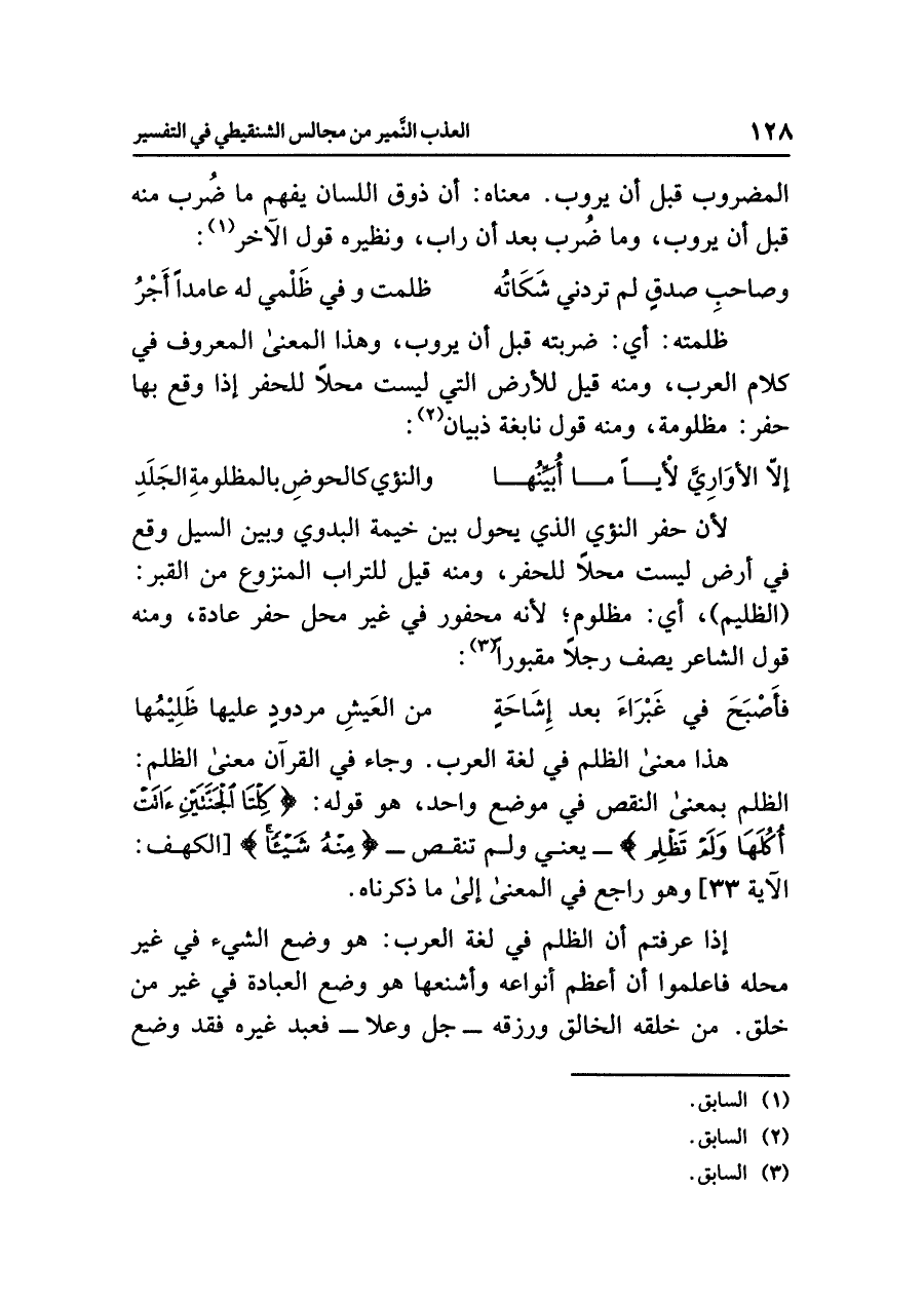 هذا معنى الظلم في لغة العرب. وجاء في القرآن معنى الظلم: الظلم بمعنى النقص في موضع واحد، هو قوله: {كِلْتَا الْجَنَّتَيْنِءَاتَتْ أُكُلَهَا وَلَمْ تَظْلِمْ} -يعني ولم تنقص- {مِنْهُ شَيْئاً} [الكهف: الآية ٣٣] وهو راجع في المعنى إلى ما ذكرناه.
