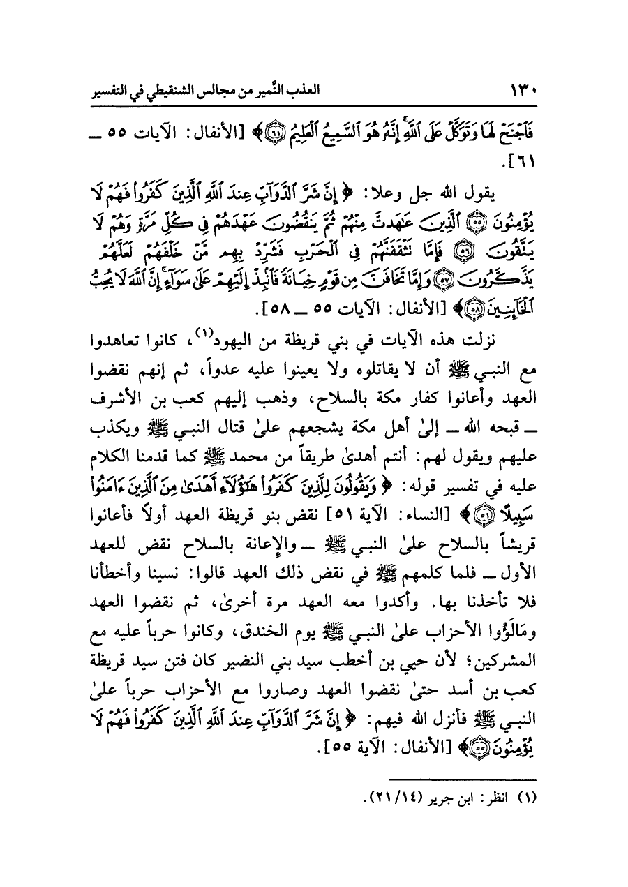 نزلت هذه الآيات في بني قريظة من اليهود (¬١)، كانوا تعاهدوا مع النبي صلى الله عليه وسلم أن لا يقاتلوه ولا يعينوا عليه عدوّاً، ثم إنهم نقضوا العهد وأعانوا كفار مكة بالسلاح، وذهب إليهم كعب بن الأشرف -قبحه الله- إلى أهل مكة يُشَجِّعُهم على قتال النبي صلى الله عليه وسلم ويكذب عليهم ويقول لهم: أنتم أهدى طريقاً مِنْ مُحَمَّدٍ صلى الله عليه وسلم كما قدمنا الكلام عليه في تفسير قوله: {وَيَقُولُونَ لِلَّذِينَ كَفَرُواْ هَؤُلاء أَهْدَى مِنَ الَّذِينَ آمَنُواْ سَبِيلاً} [النساء: الآية ٥١] نقض بنو قريظة العهد أولا فأعَانُوا قُرَيْشاً بالسلاح على النبي -صلى الله عليه وسلم- والإعانة بالسلاح نقض للعهد الأول - فلما كلمهم صلى الله عليه وسلم في نقض ذلك العهد قالوا: نسينا وأخطأنا فلا تأخذنا بها. وأكدوا معه العهد مرة أخرى، ثم نقضوا العهد ومَالَئُوا الأحزاب على النبي صلى الله عليه وسلم يوم الخندق، وكانوا حرباً عليه مع المشركين؛ لأن حيي بن أخطب سيد بني النضير كان فتن سيد قريظة كعب بن أسد حتى نقضوا العهد وصاروا مع الأحزاب حرباً على النبي صلى الله عليه وسلم فأنزل الله فيهم: {إِنَّ شَرَّ الدَّوَابِّ عِندَ اللَّهِ الَّذِينَ كَفَرُواْ فَهُمْ لَا يُؤْمِنُونَ (٥٥)} [الأنفال: الآية ٥٥].