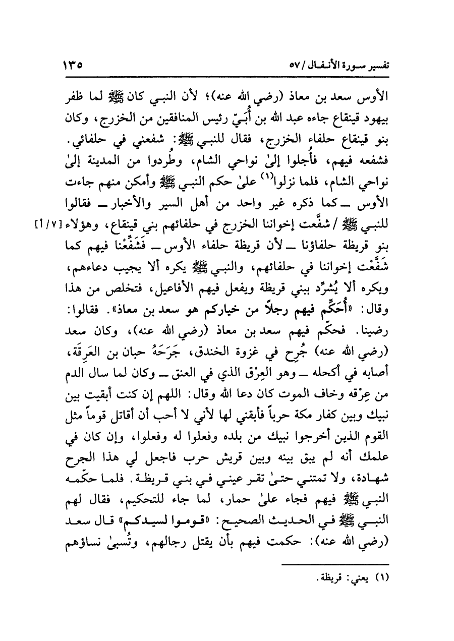 الأَوْسِ سَعْدَ بن معاذ (رضي الله عنه)؛ لأن النبي كان صلى الله عليه وسلم لما ظفر بيهود قينقاع جاءه عبد الله بن أُبيّ رئيس المنافقين من الخزرج، وكان بنو قينقاع حلفاء الخزرج، فقال للنبي صلى الله عليه وسلم: شفعني في حلفائي. فشفعه فيهم، فأُجلوا إلى نواحي الشام، وطُردوا من المدينة إلى نواحي الشام، فلما نزلوا (¬١) على حكم النبي صلى الله عليه وسلم وأمكن منهم جاءت الأوس -كما ذكره غير واحد من أهل السير والأخبار- فقالوا للنبي صلى الله عليه