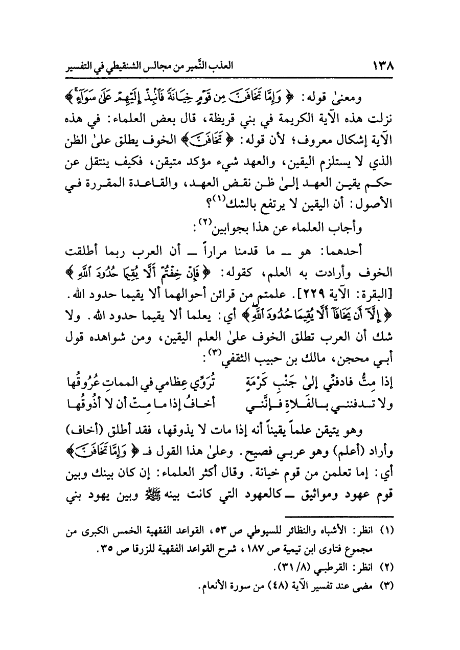 أحدهما: هو -ما قدمنا مراراً- أن العَرَبَ رُبَّمَا أطلقت الخوف وأرَادَتْ بِهِ العلم، كقوله: {فَإِنْ خِفْتُمْ أَلَاّ يُقِيمَا حُدُودَ اللَّهِ} [البقرة: الآية ٢٢٩]. علمتم من قرائن أحوالهما ألا يقيما حدود الله. {إِلَاّ أَن يَخَافَا أَلاّ يُقِيمَا حُدُودَ اللهِ} أي: يعلما ألا يقيما حُدُودَ الله. ولا شك أن العرب تطلق الخوف على العلم اليقين، ومن شواهده قول أبي محجَن، مالك بن حبيب الثقفي (¬٣):
