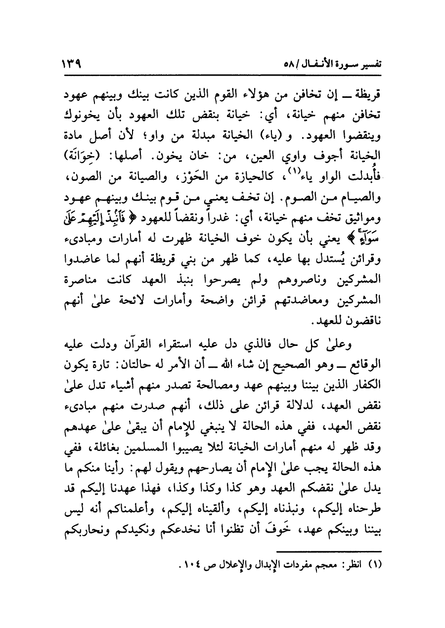 إن تَخَافَنَّ مِنْ هَؤُلاء القوم الذين كانت بينك وبينهم عهود تخافن منهم خيانة، أي: خيانة بنقض تلك العهود بأن يخونوك وينقضوا العهود. و (ياء) الخيانة مبدلة من واو؛ لأن أصل مادة الخيانة أجوف واوي العين، مِنْ: خَانَ يَخُون. أصلها: (خِوَانَة) فأبدلت الواو ياء (¬١)، كالحيازة من الحَوْز، والصيانة مِنَ الصَّوْنِ، والصّيَام من الصوم. إن تخف يعني مِنْ قَوْم بينك وبينهم عهود ومواثيق تخف منهم خيانة، أي: غدراً ونقضاً للعهود {فَانبِذْ إِلَيْهِمْ عَلَى سَوَاء} يعني بأن يكون خوف الخيانة ظهرت له أمارات ومبادِئ وقرَائِن يُسْتَدَل بها عليه، كما ظهر من بني قريظة أنهم لما عاضدوا المشركين وناصروهم ولم يصرحوا بنبذ العهد كانت مناصرة المشركين ومعاضدتهم قرائن واضحة وأمارات لائحة على أنهم ناقضون للعهد.