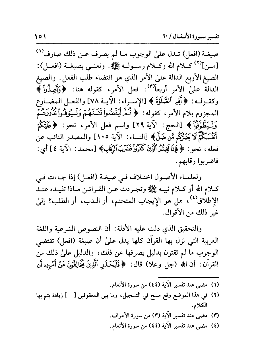 صيغة (افعل) تدل على الوجوب ما لم يصرف عن ذلك صارف (¬١) [من] (¬٢) كلام الله وكلام رسوله صلى الله عليه وسلم. ونعني بصيغة (افعل): الصيغ الأربع الدالة على الأمر الذي هو اقتضاء طلب الفعل. والصيغ الدالة على الأمر أربعاً (¬٣): فعل الأمر، كقوله هنا: {وَأَعِدُّواْ} وكقوله: {أَقِمِ الصَّلَاةَ} [الإسراء: الآية ٧٨] والفعل المضارع المجزوم بلام الأمر، كقوله: {ثُمَّ لْيَقْضُوا تَفَثَهُمْ وَلْيُوفُوا نُذُورَهُمْ وَلْيَطَّوَّفُوا} [الحج: الآية ٢٩] واسم فعل الأمر، نحو: {عَلَيْكُمْ أَنفُسَكُمْ لَا يَضُرُّكُم مَّن ضَلَّ} [النساء: الآية ١٠٥] والمصدر النائب عن فعله، نحو: {فَإِذا لَقِيتُمُ الَّذِينَ كَفَرُوا فَضَرْبَ الرِّقَابِ} [محمد: الآية ٤] أي: فاضربوا رقابهم.