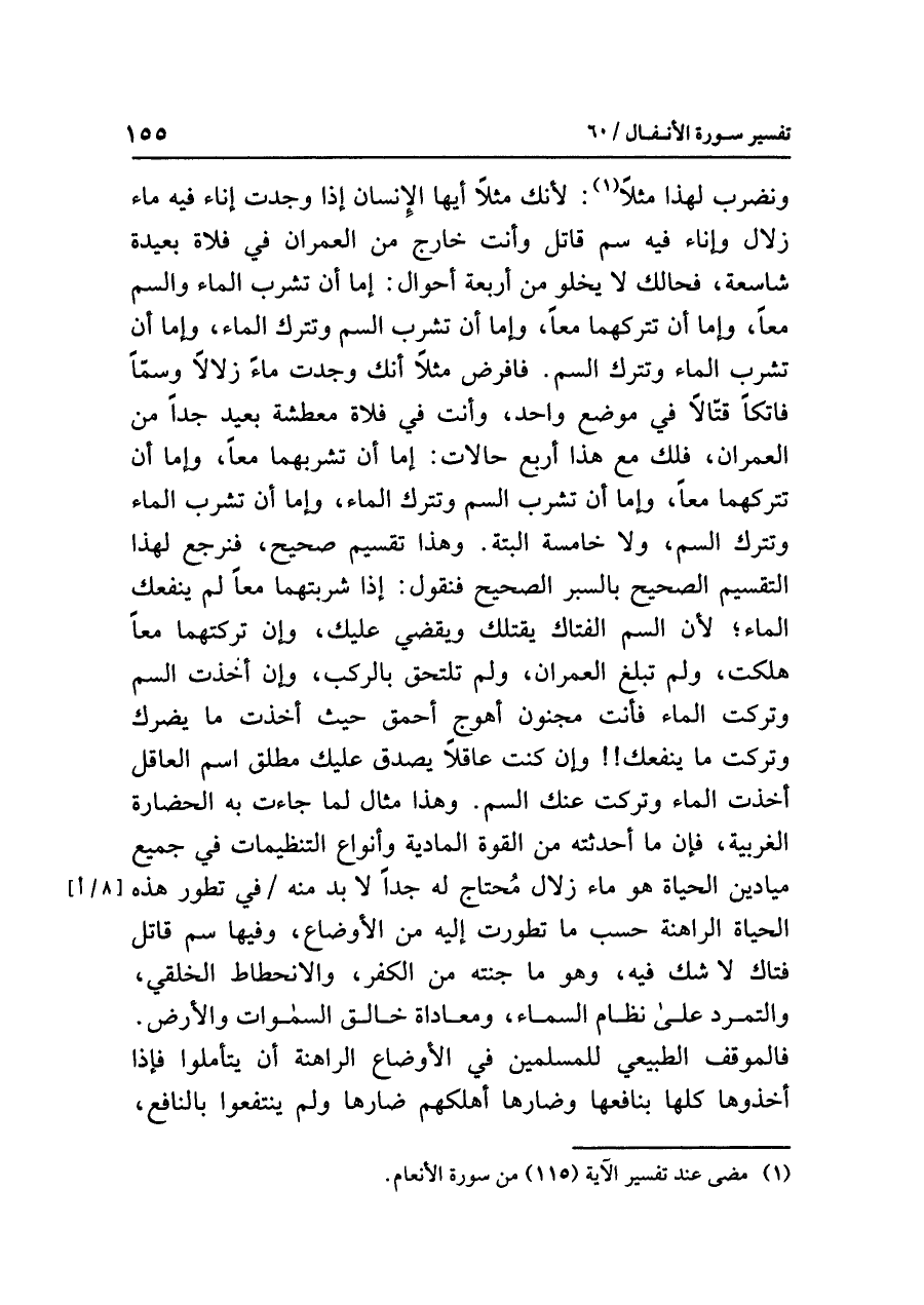 ونضرب لهذا مثلا (¬١): لأنك مثلاً أيها الإنسان إذا وجَدْتَ إناء فيه ماء زلالٌ وإناء فيه سم قاتل وأنت خارج من العمران في فلاة بعيدة شاسعة، فحالك لا يخلو من أربعة أحوال: إما أن تشرب الماء والسم معاً، وإما أن تتركهما معاً، وإما أن تشرب السم وتترك الماء، وإما أن تشرب الماء وتترك السم. فافرض مثلاً أنك وجدت ماءً زلالاً وسمّاً فاتكاً قتالاً في موضع واحد، وأنت في فلاة معطشة بعيد جدّاً من العمران، فلك مع هذا أربع حالات: إما أن تشربهما معاً، وإما أن تتركهما معاً، وإما أن تشرب السم وتترك الماء، وإما أن تشرب الماء وتترك السم، ولا خامسة البتة. وهذا تقسيم صحيح، فنرجع لهذا التقسيم الصحيح بالسبر الصحيح فنقول: إذا شربتهما معاً لم ينفعك الماء؛ لأن السم الفتاك يقتلك ويقضي عليك، وإن تركتهما معاً هلكت، ولم تبلغ العمران، ولم تلتحق بالرَّكْب، وإن أخذت السم وتركت الماء فأنت مجنون أهوج أحمق؛ حيث أخذت ما يضرك وتركت ما ينفعك!! وان كنت عاقلاً يصدق عليك مطلق اسم العاقل أخذت الماء وتركت عنك السم. وهذا مثال لما جاءت به الحضارة الغربية، فإن ما أحدثوه من القُوَّةِ المادِّيّة وأنواع التنظيمات في جميع ميادين الحياة هو ماء زلال