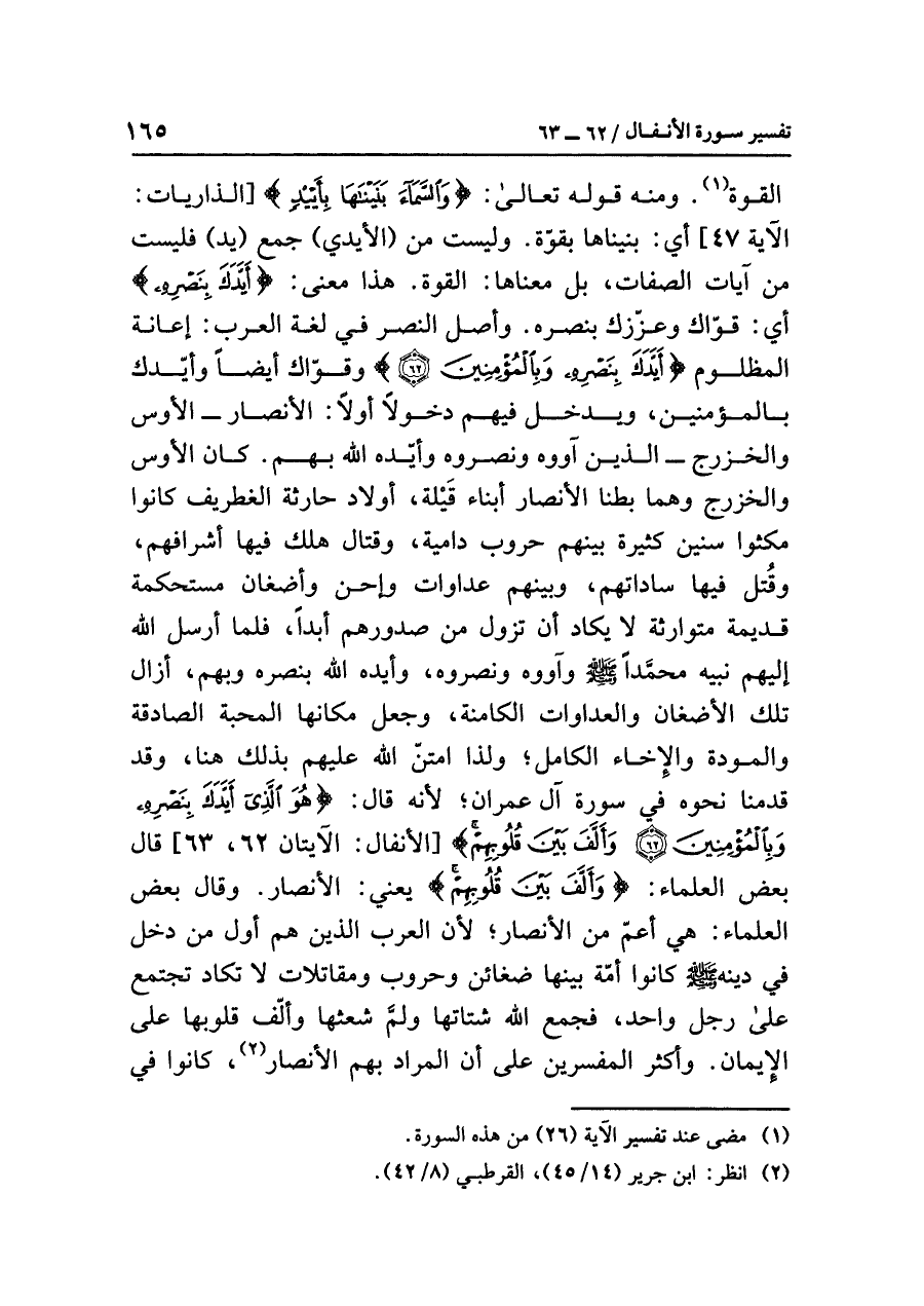 القوة (¬١). ومنه قوله تعالى: {وَالسَّمَاء بَنَيْنَاهَا بِأَيْيدٍ} [الذاريات: الآية ٤٧] أي: بنيناها بقوّة. وليست من (الأيدي) جمع (يد) فليست من آيات الصفات، بل معناها: القوة. هذا معنى: {أَيَّدَكَ بِنَصْرِهِ} أي: قَوَّاك وعزّزك بِنَصْرِهِ. وأصل النصر في لغة العرب: إعانة المظلوم {أَيَّدَكَ بِنَصْرِهِ وَبِالْمُؤْمِنِينَ} وقوّاك أيضاً وأيّدك بالمؤمنين، ويدخل فيهم دخولاً أوّلاً: الأنصار -الأوس والخزرج- الذين آووه ونصرُوهُ وأيّدَهُ اللهُ بِهِمْ. كان الأوس والخزرج وهما بطنا الأنصار أبناء قَيْلة، أولاد حارثة الغطريف كانوا مكثوا سنين كثيرة بينهم حروب دَامِية وقتال هلك فيها أشرافهم، وقُتل فيها ساداتهم، وبينهم عداوات وإحن وأضغان مستحكمة قديمة متوارثة لا يكاد أن تزول من صدورهم أبداً، فلما أرسل الله إليهم نبيه محمداً صلى الله عليه وسلم وآووه ونصروه، وأيده الله بنصره وبهم، أزال تلك الأضغان والعداوات الكامنة، وجعل مكانها المحبة الصادقة والمودة والإخاء الكامل؛ ولذا امتن الله عليهم بذلك هنا، وقد قدمنا نحوه في سورة آل عمران؛ لأنه قال: {هُوَ الَّذِيَ أَيَّدَكَ بِنَصْرِهِ وَبِالْمُؤْمِنِينَ (٦٢) وَأَلَّفَ بَيْنَ قُلُوبِهِمْ} [الأنفال: الآيتان ٦٢، ٦٣] قال بعض العلماء: {وَأَلَّفَ بَيْنَ قُلُوبِهِمْ} يعني: الأنصار. وقال بعض العلماء: هي أعم مِنَ الأنْصَارِ؛ لأن العرب الذين هم أول مَنْ دَخَلَ في دينه صلى الله عليه وسلم كانوا أمّة بينها ضَغَائِن وحروب ومقاتلات لا تكاد تجتمع على رجل واحد، فجمع الله شتاتها ولَمَّ شَعْثَهَا وألّفَ قُلُوبَهَا على الإيمان.
