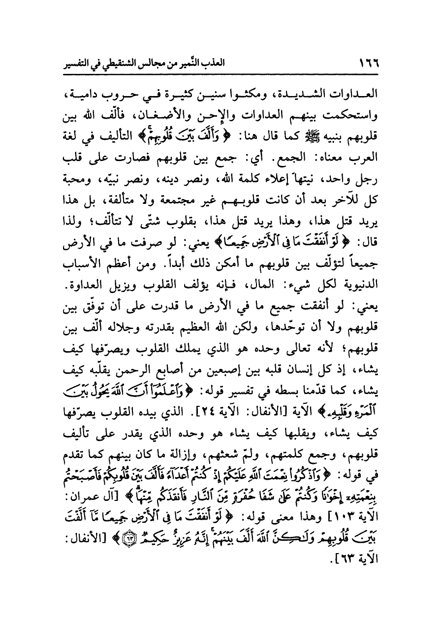 العداوات الشديدة، ومكثوا سنين كثيرة في حروب دامية، واستحكمت بينهم العداوات والإِحَنُ والأَضْغَان، فألَّف الله بين قُلُوبهم بنبيه صلى الله عليه وسلم كما قال هنا: {وَأَلَّفَ بَيْنَ قُلُوبِهِمْ} التأليف في لغة العرب معناه: الجَمْع. أي: جمع بين قلوبهم فَصَارَتْ على قلب رجل واحد، نِيَّتُها إعلاء كلمة الله، ونصر دينه، ونصر نبيّه، ومحبة كل للآخر بعد أن كانت قلوبهم غير مجتمعة ولا متألِّفَة، بل هذا يريد قتل هذا، وهذا يريد قتل هذا، بقلوب شتى لا تَتَأَلّف؛ ولذا قال: {لَوْ أَنفَقْتَ مَا فِي الأَرْضِ جَمِيعاً} يعني: لو صرفت ما في الأرض جميعًا لِتُؤَلّف بين قلوبهم ما أمْكَن ذلك أبداً. ومِنْ أعظم الأسباب الدنيوية لكل شيء: المال، فإنه يؤلِّف القُلُوبَ ويُزِيلُ العَدَاوَةَ. يعني: لَوْ أنْفَقْتَ جَمِيعَ ما في الأرض ما قدرْتَ على أن توفق بين قلوبهم ولا أن تُوَحِّدَها، ولكن الله العظيم بقدرته وجلاله أَلَّفَ بَيْنَ قلوبهم؛ لأنه تعالى وحده هو الذي يملك القلوب ويصرّفها كيف يشاء؛ إذ كل إنسان قلبه بين إصبعين من أصابع الرحمن يقلِّبه كيف يشاء، كما قدّمنا بَسْطَه في تفسير قوله: {وَاعْلَمُواْ أَنَّ اللَّهَ يَحُولُ بَيْنَ الْمَرْءِ وَقَلْبِهِ} الآية [الأنفال: الآية ٢٤]. الذي بيده القلوب يُصَرِّفُها كيف يشاء، ويقلبها كيف يشاء هو وحْدَهُ الذي يقدر على تأليف قلوبهم، وجمع كلمتهم، ولمّ شَعْثِهم، وإزالة ما كان بينهم كما تَقَدَّمَ في قوله: {وَاذْكُرُواْ نِعْمَتَ اللَّهِ عَلَيْكُمْ إِذْ كُنتُمْ أَعْدَاء فَأَلَّفَ بَيْنَ قُلُوبِكُمْ فَأَصْبَحْتُم بِنِعْمَتِهِ إِخْوَاناً وَكُنتُمْ عَلَىَ شَفَا حُفْرَةٍ مِّنَ النَّارِ فَأَنقَذَكُم مِّنْهَا} [آل عمران: الآية ١٠٣] وهذا معنى قوله: {لَوْ أَنفَقْتَ مَا فِي الأَرْضِ جَمِيعاً مَّا أَلَّفَتْ بَيْنَ قُلُوبِهِمْ وَلَكِنَّ اللَّهَ أَلَّفَ بَيْنَهُمْ إِنَّهُ عَزِيزٌ حَكِيمٌ} [الأنفال: الآية ٦٣].