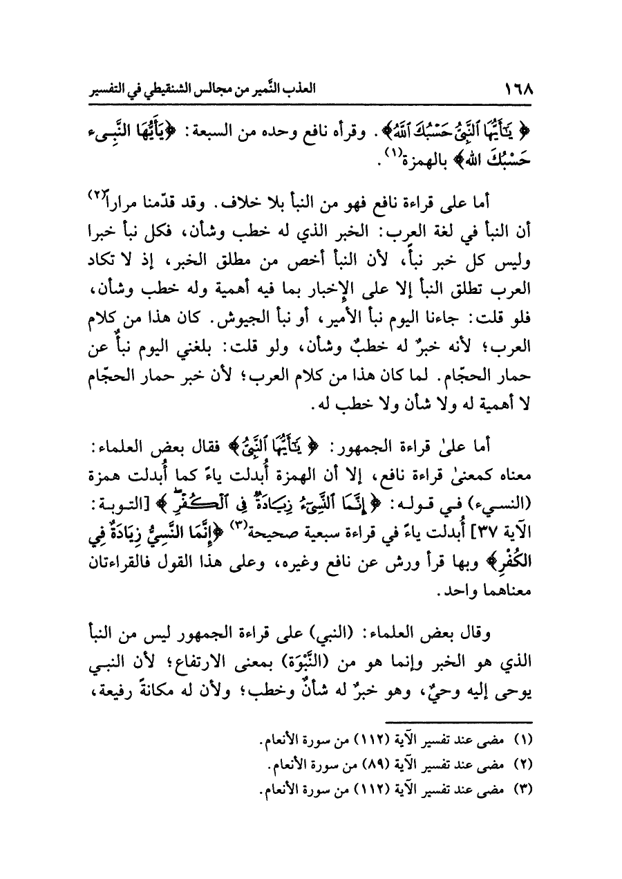{يَأَيُّهَا النَّبِيُّ حَسْبُكَ اللَّهُ} وقرأه نافع وحده من السبعة: {يَأَيُّهَا النَّبِيء حَسْبُكَ اللهُ} بالهمزة (¬١).
