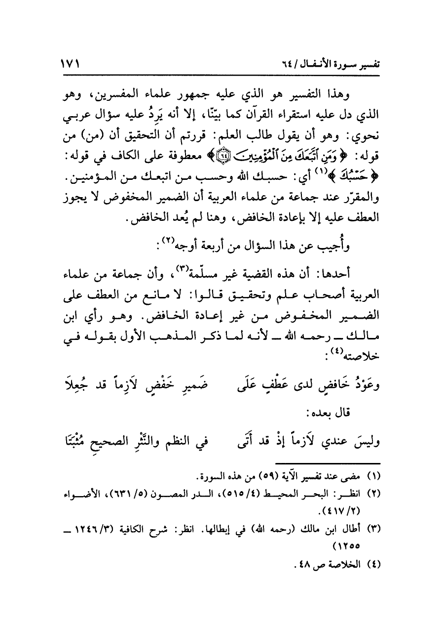 وهذا التفسير هو الذي عليه جُمْهُور عُلَماء المفَسِّرِين، وهو الذي دل عليه استقراء القرآن كما بيّنّا، إلا أنه يَرِدُ عليه سؤال عربي نحوي: وهو أن يقول طالب العلم: قررتم أن التحقيق أن (من) من قوله: {وَمَنِ اتَّبَعَكَ مِنَ الْمُؤْمِنِينَ} معطوفة على الكاف في قوله: {حَسْبُكَ} (¬١) أي: حَسْبُكَ اللهُ وَحَسْبُ مَنِ اتَّبَعَكَ مِنَ المُؤْمِنِينَ. والمقرَّر عند جماعة من علماء العربية أن الضمير المخْفُوض لا يجوز العطف عليه إلا بإعادة الخَافِض، وهنا لم يُعد الخافض.