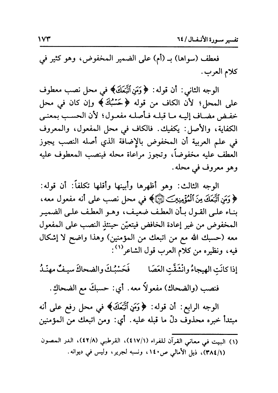 الوجه الثالث: وهو أظهرها وأبينها وأقلها تكلفاً: أن قوله: {وَمَنِ اتَّبَعَكَ مِنَ الْمُؤْمِنِينَ} في محل نصب على أنه مفعول معه، بناء على القول بأن العطف ضعيف، وهو العطف على الضمير المخفوض من غير إعادة الخافض فيتعيّن حينئذٍ النصب على المفعول معه (حسبك الله مع من اتبعك من المؤمنين) وهذا واضح لا إشكال فيه، ونظيره من كلام العرب قول الشاعر (¬١):