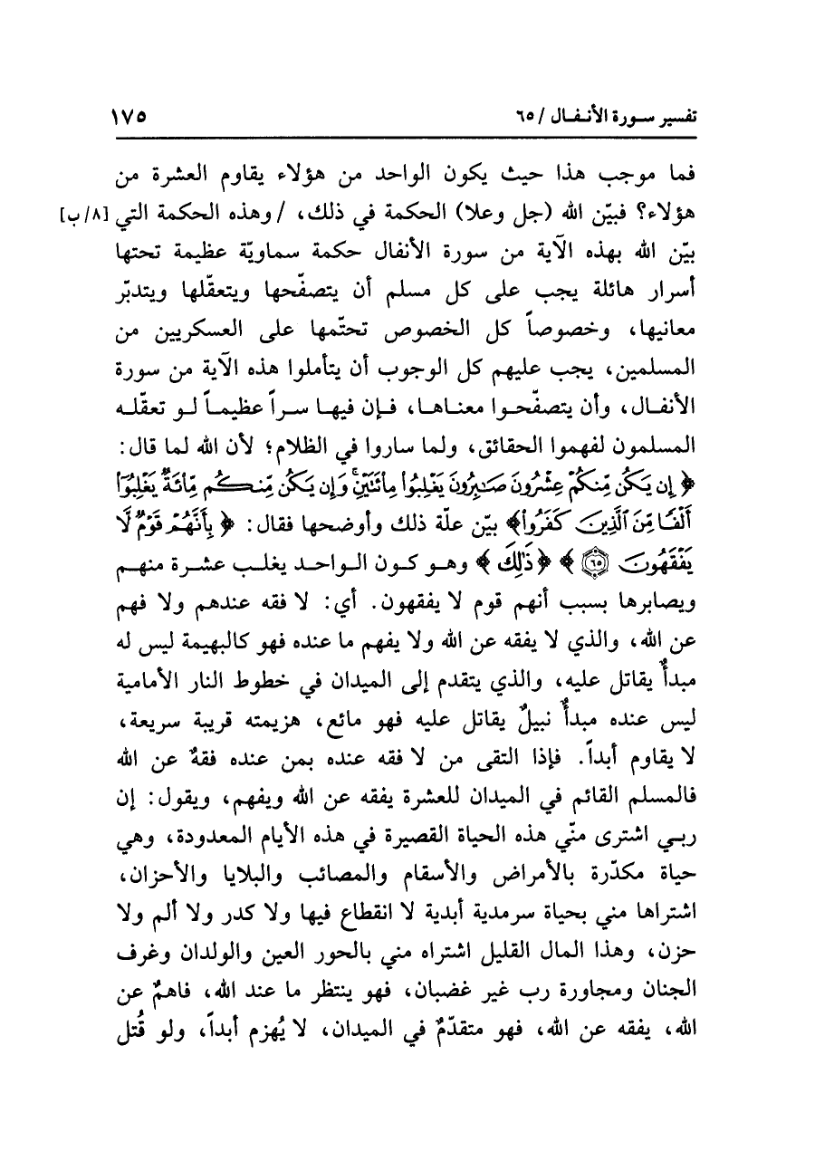 [٨/ب] فبيّن الله (جل وعلا) الحكمة في ذلك،/ وهذه الحكمة التي بيّن الله بهذه الآية من سورة الأنفال حكمة سماويّة عَظِيمَة تحتها أسرار هائلة يجب على كل مسلم أن يَتَصَفَّحَهَا ويَتَعَقّلَهَا ويتَدَبَّرَ مَعَانِيَهَا، وخصوصاً كل الخصوص تحتّمها على العسكريين من المسلمين، يجب عليهم كل الوجوب أن يتأملوا هذه الآية من سورة الأنفال، وأَنْ يَتَصَفَّحُوا مَعْنَاهَا؛ فإن فيها سرّاً عظيماً لو تعقّله المسلمون لفهموا الحقائق، ولما ساروا في الظلام؛ لأن الله لما قال: {إِن يَكُن مِّنكُمْ عِشْرُونَ صَابِرُونَ يَغْلِبُواْ مِئَتَيْنِ وَإِن يَكُن مِّنكُم مِّئَةٌ يَغْلِبُواْ أَلْفاً مِّنَ الَّذِينَ كَفَرُواْ} بيّن علّة ذلك وأوضحها فقال: {بِأَنَّهُمْ قَوْمٌ لَاّ يَفْقَهُونَ} {ذَلِكَ} وهو كون الواحد يغلب عشرة منهم ويصابرها بسبب أنهم قوم لا يفقهون. أي: لا فقه عندهم ولا فهم عن الله، والذي لا يفقه عن الله ولا يفهم ما عنده فهو كالبهيمة ليس له مبدأ يقاتل عليه، والذي يتقدم إلى الميدان في خطوط النار الأمامية ليس عنده مبدأ نبيل يقاتل عليه فهو مائع، هزيمته قريبة سريعة، لا يقاوم أبداً.