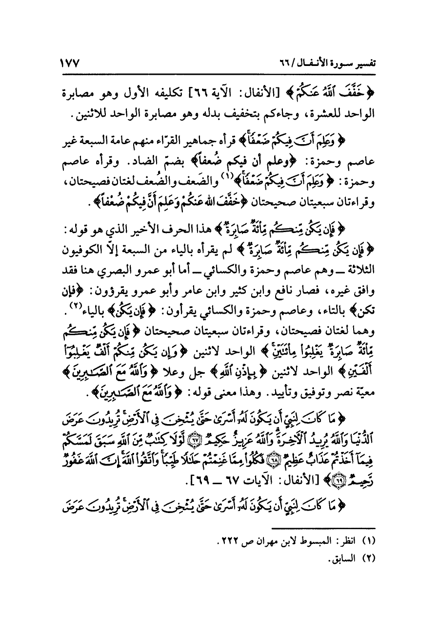 {فَإِن يَكُن مِّنكُم مِّئَةٌ صَابِرَةٌ} هذا الحرف الأخير الذي هو قوله: {فََإِن يَكُن مِّنكُم مِّئَةٌ صَابِرَةٌ} لم يقرأه بالياء من السبعة إلا الكوفيون الثلاثة -وهم عاصم وحمزة والكسائي- أما أبو عمرو البصري هذا فقد وافق غَيْرَهُ، فَصَارَ نافع وابن كثير وابن عامر وأبو عمرو يقرؤون: {فإن تكن} بالتاء، وعاصم وحمزة والكسائي يقرؤون: {فَإِن يَكُن} بالياء (¬٢). وهما لغتان فصيحتان، وقراءتان سَبْعِيَّتَان صَحِيحتَانِ {فَإِن يَكُن مِّنكُم مِّئَةٌ صَابِرَةٌ يَغْلِبُواْ مِئَتَيْنِ} الواحد لاثنين {وَإِن يَكُن مِّنكُمْ أَلْفٌ يَغْلِبُواْ أَلْفَيْنِ} الواحد لاثنين {بِإِذْنِ اللَّهِ} جل وعلا {وَاللَّهُ مَعَ الصَّابِرِينَ} معيّة نصر وتوفيق وتأييد. وهذا معنى قوله: {وَاللَّهُ مَعَ الصَّابِرِينَ}.