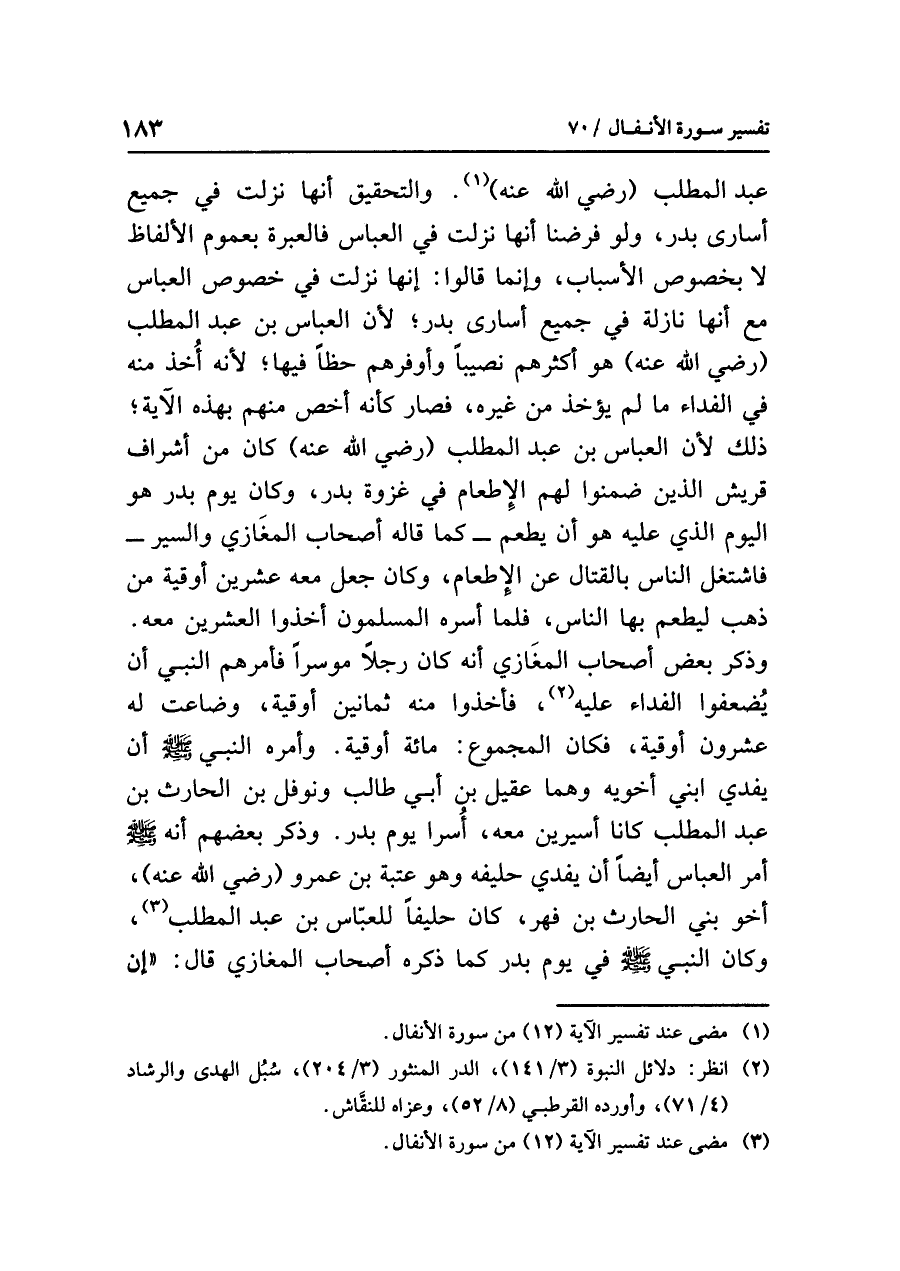 عبد المطلب (رضي الله عنه) (¬١). والتحقيق أنها نزلت في جميع أسارى بدر، ولو فرضنا أنها نزلت في العباس فالعبرة بعموم الألفاظ لا بخصوص الأسباب، وإنما قالوا: إنها نزلت في خصوص العباس مع أنها نازلة في جميع أسارى بدر؛ لأن العباس بن عبد المطلب (رضي الله عنه) هو أكثرهم نصيباً وأوفرهم حظّاً فيها؛ لأنه أُخذ منه في الفداء ما لم يؤخذ من غيره، فصار كأنه أخَصّ منهم بهذه الآية؛ ذلك لأن العباس بن عبد المطلب (رضي الله عنه) كان مِنْ أَشْرافِ قُرَيْشٍ الذين ضمنوا لهم الإطعام في غزوة بدر، وكان يوم بدر هو اليوم الذي عليه هو أن يطعم -كما قاله أصحاب المغازي والسير- فاشتغل الناس بالقتال عن الإطعام، وكان جعل معه عشرين أوقية مِنْ ذَهَبٍ ليطعم بها الناس، فلمَّا أَسَرَهُ المسْلِمُون أخذوا العشرين معه. وذكر بعض أصحاب المغَازي أنَّهُ كان رجلاً موسراً فأمرهم النبي أن يُضعِّفُوا الفداء عليه (¬٢)، فأخذوا منه ثمانين أوقية، وضاعت له عشرون أوقية، فكان المجموع: مائة أوقية. وأمره النبي صلى الله عليه وسلم أَنْ يُفْدِي ابْنَيْ أخَوَيْهِ وهما عقيل بن أبي طالب ونَوْفَل بن الحارث بن عبد المطلب كانا أسيرين معه، أُسِرَا يَوْمَ بَدْر. وذكر بعضهم أنه صلى الله عليه وسلم أَمَرَ العَبَّاسَ أَيْضاً أن يُفْدِي حَلِيفَهُ وهو عُتْبَة بن عمرو (رضي الله عنه)، أخو بني الحارث بن فهر، كان حليفاً للعبَّاس بن عبد المطلب (¬٣)، وكان النبي صلى الله عليه وسلم في يوم بدر كما ذكره أصحاب المغازي قال: «إِنَّ