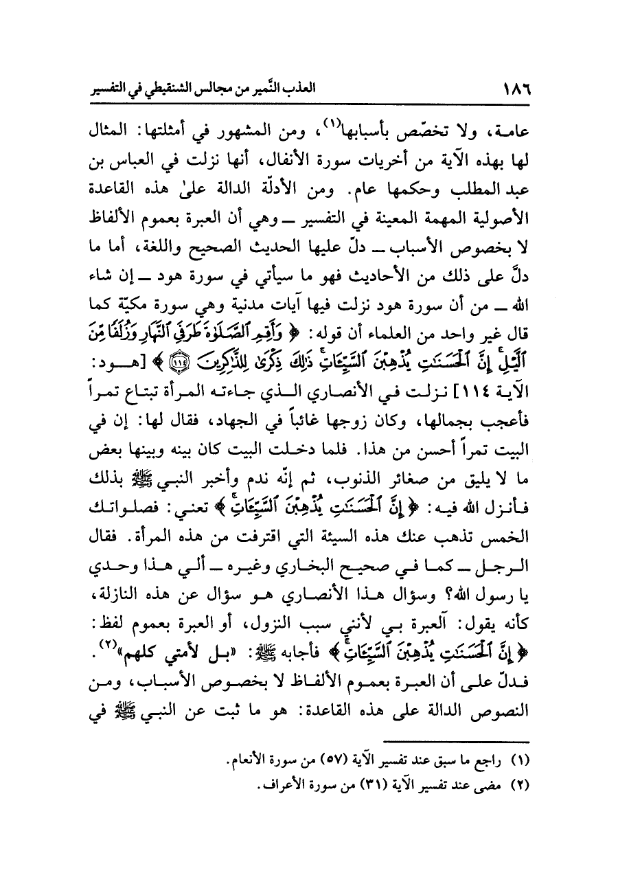 ومن الأدلّة الدالة على هذه القاعدة الأصولية المهِمَّة المُعِينَة في التفسير -وهي أن العبرة بعموم الألفاظ لا بخصوص الأسباب- دلّ عليها الحديث الصحيح واللغة، أما ما دلّ على ذلك من الأحاديث فهو ما سيأتي في سورة هود -إن شاء الله- من أن سورة هود نزلت فيها آيات مَدَنِيَّة وهي سورة مكية كما قال غير واحد من العلماء أن قوله: {وَأَقِمِ الصَّلَاةَ طَرَفَيِ النَّهَارِ وَزُلَفاً مِّنَ اللَّيْلِ إِنَّ الْحَسَنَاتِ يُذْهِبْنَ السَّيِّئَاتِ ذَلِكَ ذِكْرَى لِلذَّاكِرِينَ (١١٤)} [هود: الآية ١١٤] نزلت في الأنصاري الذي جاءته المرأة تبتاع تمراً فأعجب بجمالها، وكان زوجها غائباً في الجهاد، فقال لها: إن في البيت تمراً أحسن من هذا. فلما دخلت البيت كان بينه وبينها بعض ما لا يليق من صغائر الذنوب، ثم إنّه ندم وأخبر النبي صلى الله عليه وسلم بذلك، فأنزل الله فيه: {إِنَّ الْحَسَنَاتِ يُذْهِبْنَ السَّيِّئَاتِ} تعني: فصلواتك الخمس تذهب عنك هذه السيئة التي اقترفت من هذه المرأة. فقال الرجل -كما في صحيح البخاري وغيره- ألي هذا وحدي يا رَسُول الله؟ وسؤال هذا الأنصاري هو سؤال عن هذه النازلة، كأنه يقول: آلعبرة بي لأنني سبب النزول، أو العبرة بعموم لفظ: {إِنَّ الْحَسَنَاتِ يُذْهِبْنَ السَّيِّئَاتِ} فأجابه صلى الله عليه وسلم: «بَلْ لأُمَّتِي كُلِّهِمْ» (¬٢). فَدَلّ على أن العبرة بعموم الألفاظ لا بخصوص الأسباب، ومن النصوص الدالة على هذه القاعدة: هو ما ثبت عن النبي صلى الله عليه وسلم في