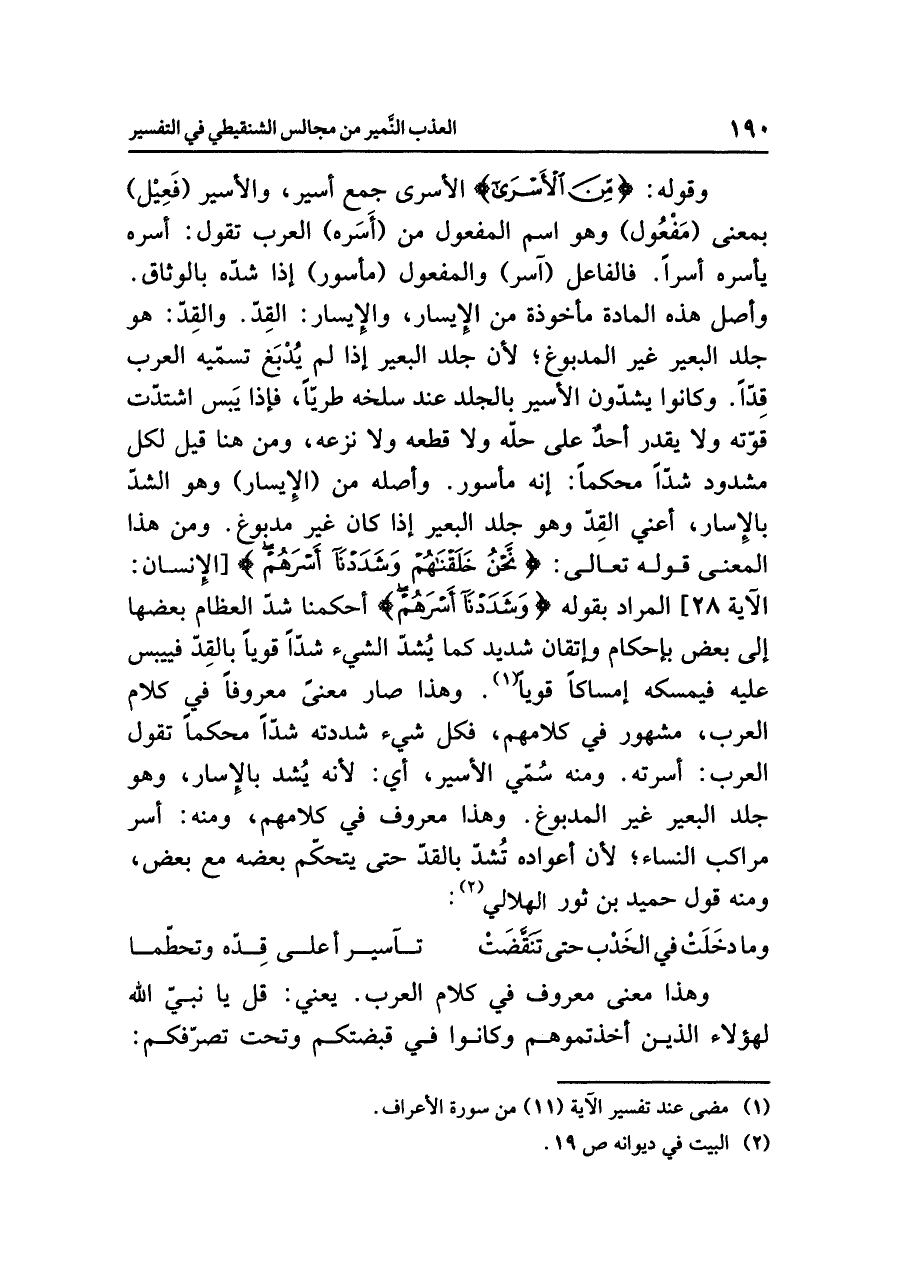 وقوله: {مِّنَ الأَسْرَى} الأسرى جمع أسير، والأسير (فَعِيل) بمعنى (مَفعُول) وهو اسم المفعول من (أَسَره) العرب تقول: أسره يأسره أسراً، فالفاعل (آسر) والمفعول (مأسور): إذا شدّه بالوثاق، وأصل هذه المادة مأخوذة من الإيسار، والإيسار: القِدّ. والقِدّ: هو جلد البعير غير المدبوغ؛ لأن جلد البعير إذا لم يُدْبَغ تسمّيه العرب قِدّاً، وكانوا يشدّون الأسِيرَ بالجلد عند سَلْخِهِ طَرِيّاً، فإذا يَبس اشتدّت قوّته ولا يقدر أحد على حلّه ولا قطعه ولا نزعه، ومن هنا قيل لكل مشدود شدّاً محكماً: إنه مأسور. وأصله من (الإيسار) وهو الشدّ بالإسار، أعني القِدّ وهو جلد البعير إذا كان غير مدبوغ. ومن هذا المعنى قوله تعالى: {نَحْنُ خَلَقْنَاهُمْ وَشَدَدْنَا أَسْرَهُمْ} [الإنسان: الآية ٢٨] المراد بقوله: {وَشَدَدْنَا أَسْرَهُمْ} أحْكَمْنَا شَدَّ العِظَامَ بَعْضَها إِلَى بَعْضٍ بِإِحْكَام وإِتْقَانٍ شَدِيدٍ كَمَا يُشَدُّ الشَّيْءُ شَدّاً قويّاً بالقِدّ فييبس عليه فيمسكه إمساكاً قويًّا (¬١). وهذا صار معنىً معروفاً في كلام العرب، مشهور في كلامهم، فكل شيء شددته شدّاً محكماً تقول العرب: أسرته. ومنه سُمّي الأسير، أي: لأنه يُشد بالإسار، وهو جلد البعير غير المدبوغ. وهذا معروف في كلامهم، ومنه: أسر مراكب النساء؛ لأن أعواده تُشدّ بالقدّ حتى يتحكّم بعضه مع بعض، ومنه قول حُمَيْدِ بن ثور الهلالي (¬٢):