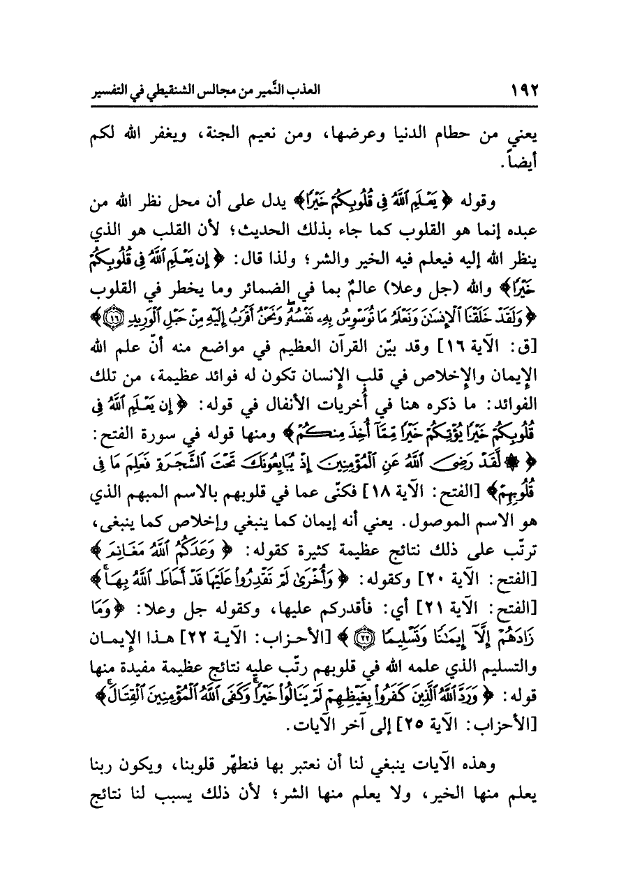 وقوله {يَعْلَمِ اللَّهُ فِي قُلُوبِكُمْ خَيْراً} يدل على أن محل نَظَرِ اللهِ من عبده إنما هو القلوب كما جاء بذلك الحديث؛ لأن القلب هو الذي ينظر الله إليه فيعلم فيه الخير والشر؛ ولذا قال: {إِن يَعْلَمِ اللهُ فِي قُلُوبِكُمْ خَيْراً} والله (جل وعلا) عالمٌ بما في الضمائر وما يخطر في القلوب {وَلَقَدْ خَلَقْنَا الإِنسَانَ وَنَعْلَمُ مَا تُوَسْوِسُ بِهِ نَفْسُهُ وَنَحْنُ أَقْرَبُ إِلَيْهِ مِنْ حَبْلِ الْوَرِيدِ (١٦)} [ق: الآية ١٦] وقد بيّن القرآن العظيم في مواضع منه أنّ علم الله الإيمان والإخلاص في قلب الإنسان تكون له فوائد عظيمة، من تلك الفوائد: ما ذكره هنا في أخريات الأنفال في قوله: {إِن يَعْلَمِ اللَّهُ فِي قُلُوبِكُمْ خَيْراً يُؤْتِكُمْ خَيْراً مِّمَّا أُخِذَ مِنكُمْ} ومنها قوله في سورة الفتح: {لَقَدْ رَضِيَ اللَّهُ عَنِ الْمُؤْمِنِينَ إِذْ يُبَايِعُونَكَ تَحْتَ الشَّجَرَةِ فَعَلِمَ مَا فِي قُلُوبِهِمْ} [الفتح: الآية ١٨] فَكَنّى عما في قلوبهم بالاسم المبْهَمِ الَّذِي هُوَ الاسْمُ الموْصول. يعني أنه إيمان كما ينبغي وإخلاص كما ينبغي، ترتّب على ذلك نتائج عظيمة كثيرة كقوله: {وَعَدَكُمُ اللَّهُ مَغَانِمَ} [الفتح: الآية ٢٠] وكقوله: {وَأُخْرَى لَمْ تَقْدِرُوا عَلَيْهَا قَدْ أَحَاطَ اللَّهُ بِهَا} [الفتح: الآية ٢١] أي: فأقدركم عليها، وكقوله جل وعلا: {وَمَا زَادَهُمْ إِلَاّ إِيمَاناً وَتَسْلِيماً} [الأحزاب: الآية ٢٢] هذا الإيمان والتسليم الذي علمه الله في قلوبهم رتّب عليه نتائج عظيمة مفيدة منها قوله: {وَرَدَّ اللَّهُ الَّذِينَ كَفَرُوا بِغَيْظِهِمْ لَمْ يَنَالُوا خَيْراً وَكَفَى اللَّهُ الْمُؤْمِنِينَ الْقِتَالَ} [الأحزاب: الآية ٢٥] إلى آخر الآيات.