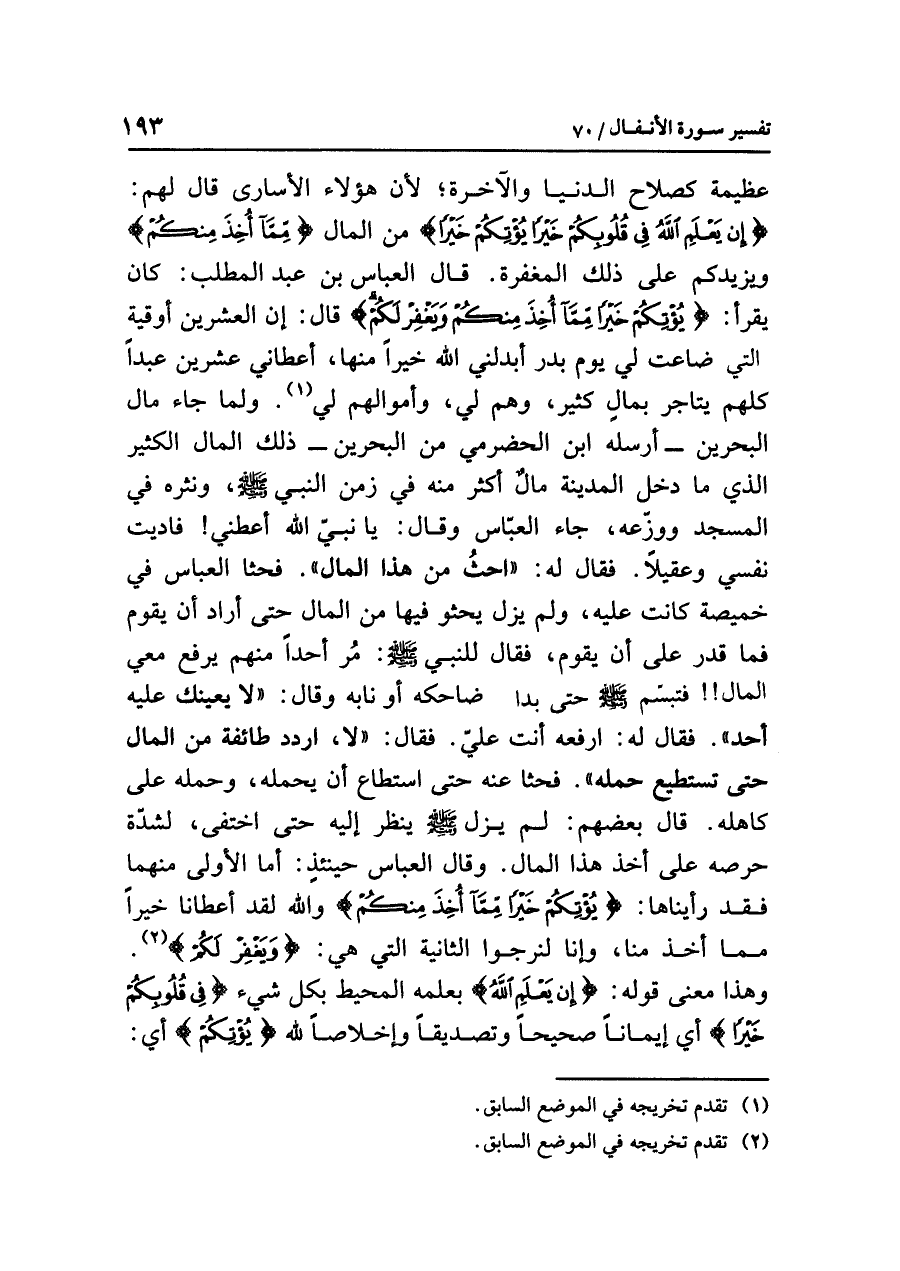 عَظِيمَة كصلاح الدنيا والآخرة؛ لأن هؤلاء الأسرى قال لهم: {إِن يَعْلَمِ اللَّهُ فِي قُلُوبِكُمْ خَيْراً يُؤْتِكُمْ خَيْراً} من المال {مِّمَّا أُخِذَ مِنكُمْ} ويزيدكم على ذلك المغفرة. قال العباس بن عبد المطلب: كان يقرأ: {يُؤْتِكُمْ خَيْراً مِّمَّا أُخِذَ مِنكُمْ وَيَغْفِرْ لَكُمْ} قال: إن العشرين أوقية التي ضَاعَتْ لِي يَوْمَ بَدْر أبْدَلَنِي الله خيراً منها، أعطاني عشرين عبداً كلهم يتاجر بمالٍ كثير، وهم لي، وأموالهم لي (¬١). ولما جاء مال البحرين -أرسله ابن الحضرمي من البحرين- ذلك المال الكثير الذي ما دخل المدينة مالٌ أكثر منه في زمن النبي صلى الله عليه وسلم، ونثره في المسجد ووزّعه، جاء العباس وقال: يا نبيّ الله أعطني! فاديت نفسي وعقيلاً. فقال له: «احثُ من هذا المال». فحثا العباس في خميصة كانت عليه، ولم يزل يحثو فيها من المال حتى أراد أن يقوم فما قدر على أن يقوم، فقال للنبي صلى الله عليه وسلم: مُر أحداً منهم يرفع معي المال!! فتبسّم صلى الله عليه وسلم حتى بدا ضاحكه أو نابه وقال: «لا يُعِينُكَ عَلَيْهِ أحَدٌ». فقال له: ارفعه أنت عليّ. فقال: «لا، اردُد طائِفة من المَال حتَّى تَسْتَطِيعَ حَمْلَهُ». فحثا عنه حتى استطاع أن يحمله، وحمله على كاهله. قال بعضهم: لم يزل صلى الله عليه وسلم ينظر إليه حتى اختفى، لشدّة حرصه على أخذ هذا المال، وقال العباس حينئذ: أما الأولى منهما فقد رأيناها: {يُؤْتِكُمْ خَيْراً مِّمَّا أُخِذَ مِنكُمْ} والله لقد أعطانا خيراً مما أُخِذَ مِنَّا، وإنا لنرجو الثانية التي هي: {وَيَغْفِرْ لَكُمْ} (¬٢). وهذا معنى قوله: {إِن يَعْلَمِ اللَّهُ} بعلمه المحيط بكل شيء {فِي قُلُوبِكُمْ خَيْراً} أي إيماناً صحيحاً وتصديقاً وإخلاصاً لله {يُؤْتِكُمْ} أي: