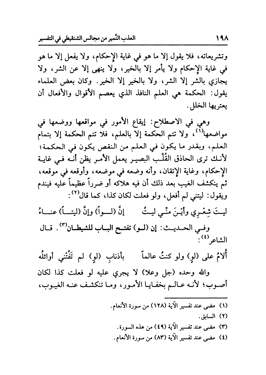 وتشريعاته، فلا يقول إلا ما هو في غاية الإِحْكَام، ولا يَفْعَلُ إلا ما هو في غَايَةِ الإِحْكَامِ ولا يأمر إلا بالخَيْرِ، ولا ينهى إلا عَنِ الشَّرِّ، ولا يجازي بالشَّرِّ إلا الشر، ولا بالخير إلا الخير. وكان بعض العلماء يقول: الحكمة هي العلم النافذ الذي يَعْصِمُ الأقْوَالَ والأفْعَالَ أن يَعْتَرِيها الخلل.