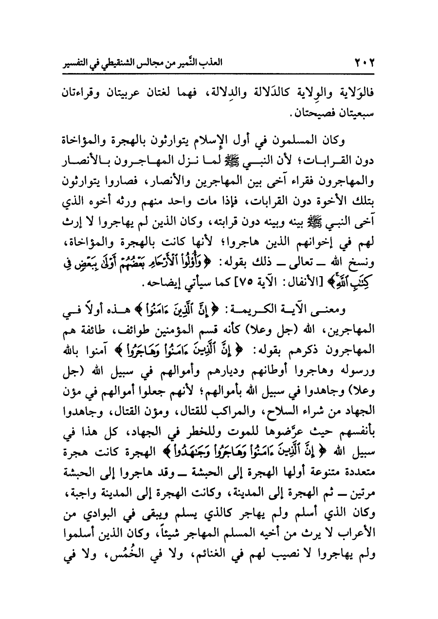 ومعنى الآية الكريمة: {إِنَّ الَّذِينَ آمَنُواْ} هذه أولاً في المهاجرين، الله (جل وعلا) كأنه قَسَّمَ المؤْمِنِينَ طَوَائِف، طائفة هم المهاجرون ذكرهم بقوله: {إنَّ الَّذِينَ آمَنُواْ وَهَاجَرُواْ} آمَنُوا بِاللهِ ورسوله وهاجروا أوطانهم وديارهم وأموالهم في سبيل الله (جل وعلا) وجاهدوا في سبيل الله بأموالهم؛ لأنهم جعلوا أموالهم في مؤن الجهاد من شراء السلاح، والمراكب للقتال، ومؤن القتال، وجاهدوا بأنفسهم حيث عرّضوها للموت وللخطر في الجهاد، كل هذا في سبيل الله {إِنَّ الذّينَ آمَنُواْ وَهَاجَرُواْ وَجَاهَدُواْ} الهِجْرَة كانت هجرة متعددة متنوعة أولها الهجرة إلى الحبشة -وقد هاجروا إلى الحبشة مرتين- ثم الهجرة إلى المدينة، وكانت الهجرة إلى المدينة واجبة، وكان الذي أسلم ولم يهاجر كالذي يسلم ويبقى في البَوَادِي مِنَ الأعراب لا يرث من أخيه المسلم المهاجر شيئاً، وكان الذين أسلموا ولم يهاجروا لا نصيب لهم فِي الغَنَائِمِ، ولا في الخمُس، ولا في