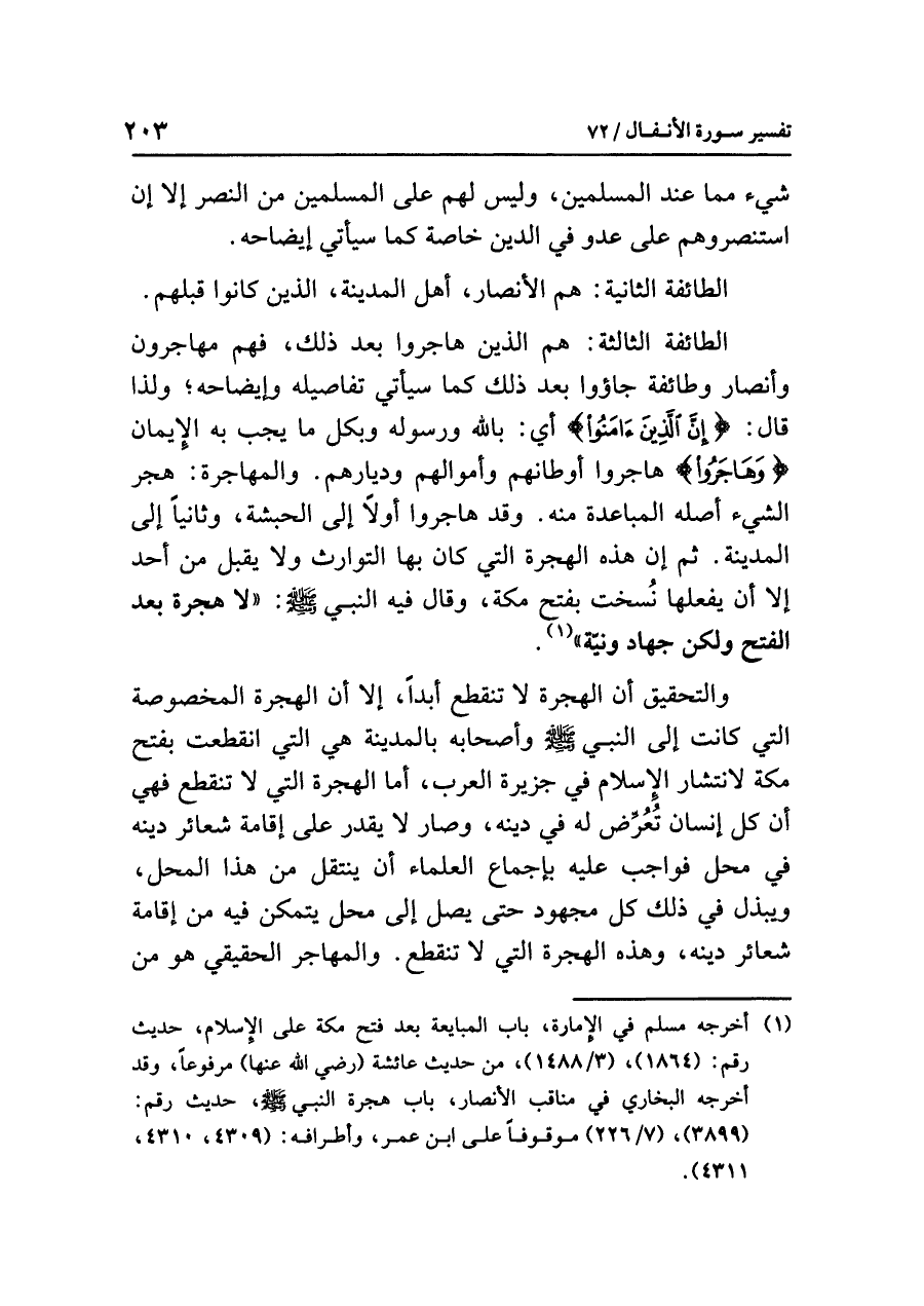 الطائفة الثالثة: هم الذين هاجروا بعد ذلك، فهم مهاجرون وأنصار، وطائفة جاءوا بعد ذلك كما سيأتي تفاصيله وإيضاحه؛ ولذا قال: {إِنَّ الَّذِينَ آمَنُوا} أي: بالله ورسوله وبكل ما يجب به الإيمان {وَهَاجَرُوا} هاجروا أوطانهم وأموالهم وديارهم. والمُهَاجَرَة: هَجْرُ الشَّيْءِ أصْلُهُ المُبَاعَدَةُ مِنْه. وقد هاجروا أولاً إلى الحبشة، وثانياً إلى المدينة. ثم إن هذه الهجرة التي كان بها التَّوَارُث ولا يقبل من أحد إلا أن يفعلها نُسِخَتْ بِفَتْحِ مكة، وقال فيه النبي صلى الله عليه وسلم: «لَا هِجْرَةَ بَعْدَ الْفَتْحِ وَلَكِنْ جِهَادٌ وَنِيّةٌ» (¬١).