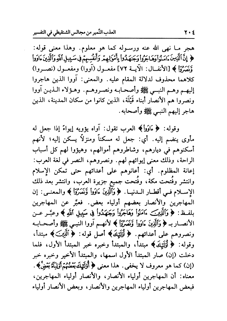 هَجَرَ ما نَهَى اللهُ عَنْهُ ورسوله كما هو معلوم. وهذا معنى قوله: {إِنَّ الَّذِينَ آمَنُواْ وَهَاجَرُواْ وَجَاهَدُواْ بِأَمْوَالِهِمْ وَأَنفُسِهِمْ فِي سَبِيلِ اللَّهِ وَالَّذِينَ آوَواْ وَّنَصَرُواْ} [الأنفال: الآية ٧٢] مفعول (آووا) ومفعول (نصروا) كلاهما محذوف لدلالة المقام عليه، والمعنى: آوَوْا الذين هَاجَرُوا إِلَيْهِمْ وهم النبي صلى الله عليه وسلم وأصحابه ونصروهم. وهؤلاء الذين آووا ونصروا هم الأنصار أبناء قَيْلَة، الذين كانوا من سكان المدينة، الذين هاجر إليهم النبي صلى الله عليه وسلم وأصحابه.