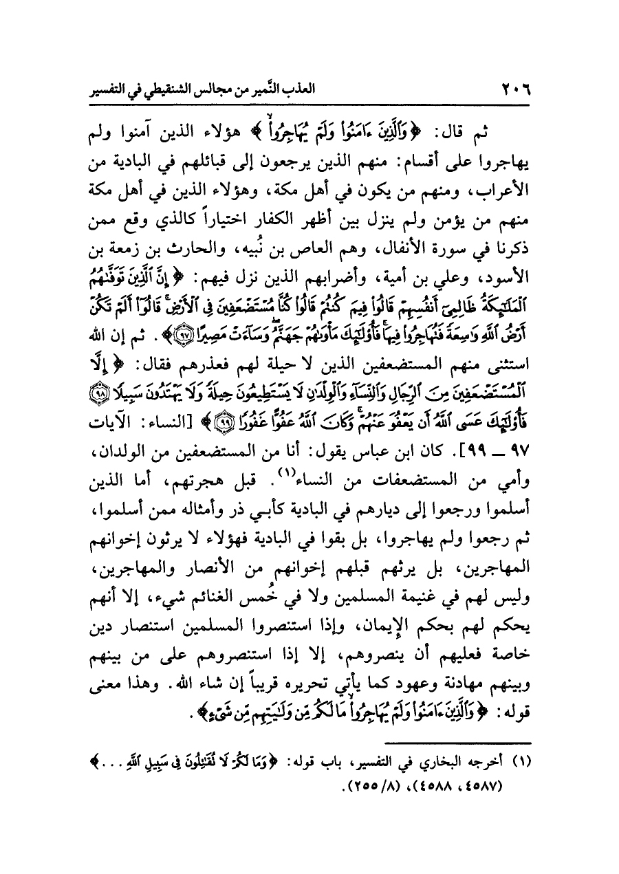 (¬١) أخرجه البخاري في التفسير، باب قوله: {وَمَا لَكُمْ لَا تُقَاتِلُونَ فِي سَبِيلِ اللَّهِ ... } (٤٥٨٧، ٤٥٨٨)، (٨/ ٢٥٥).