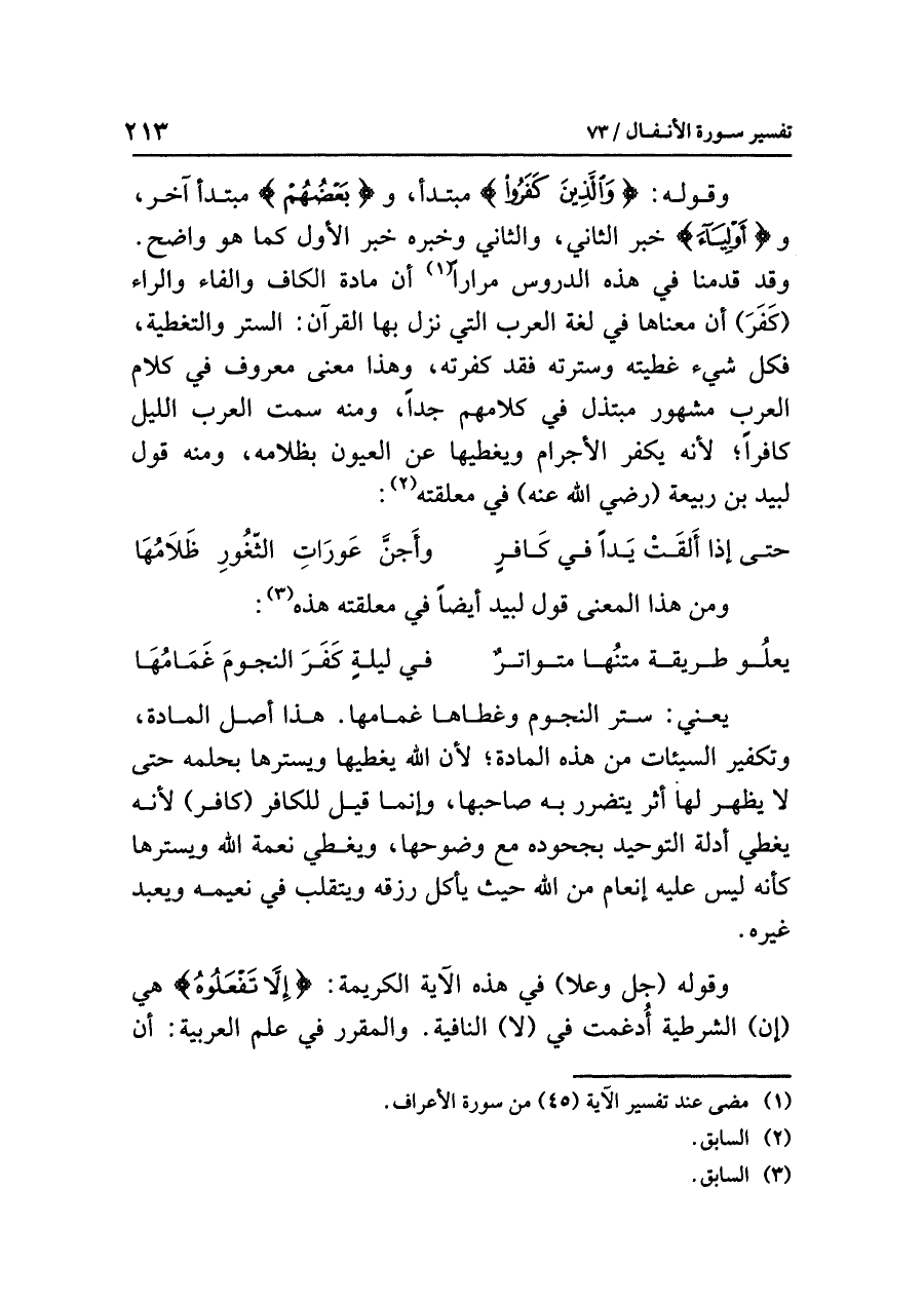وقوله: {وَالَّذينَ كَفَرُواْ} مبتدأ، و {بَعْضُهُمْ} مبتدأ آخر، و {أَوْلِيَاء} خبر الثاني، والثاني وخبره خبر الأول كما هو واضح. وقد قَدَّمْنَا في هَذِهِ الدروس مراراً (¬١) أن مادة الكاف والفاء والراء (كَفَرَ) أن معناها في لغة العرب التي نزل بها القرآن: السّتْر والتغطية، فكل شيء غطيته وسترته فقد كفرته، وهذا معنى معروف في كلام العرب مشهور مبتذل في كلامهم جدّاً، ومنه سَمَّتِ العَرَبُ اللَّيْلَ كافِراً؛ لأنه يكفر الأجرام ويغطيها عن العيون بظلامه، ومنه قول لبيد بن ربيعة (رضي الله عنه) في معلقته (¬٢):