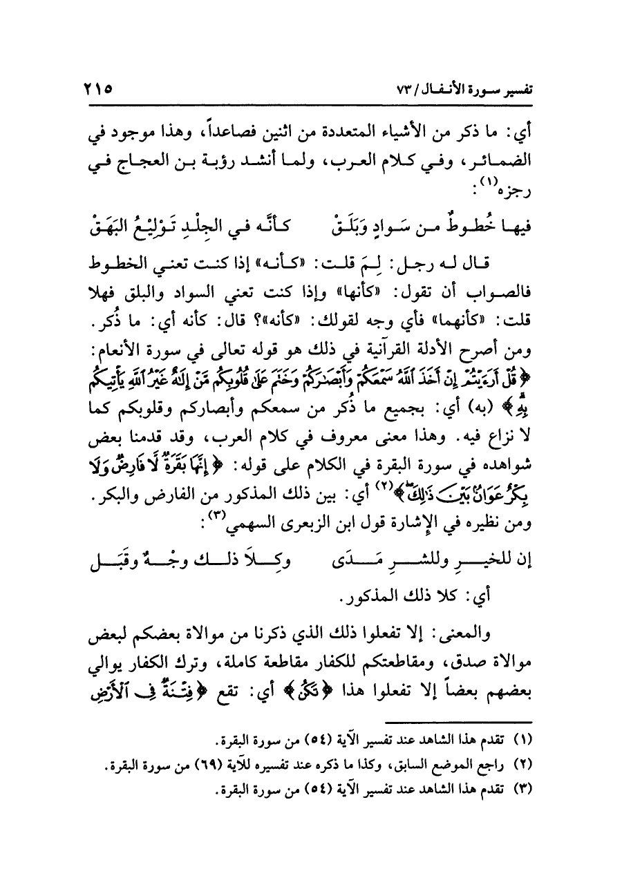 قال له رجل: لِمَ قلت: «كأنَّهُ» إذا كنت تعني الخطوط فالصواب أن تقول: «كأنَّهَا» وإذا كنت تعني السواد والبلق فهلا قلت: «كَأَنَّهُمَا» فأي وجه لقولك: «كأنه»؟ قال: كأنه أي: ما ذُكر. ومِنْ أَصْرَحِ الأدِلَّةِ القرآنية في ذلك هو قوله تعالى في سورة الأنعام: {قُلْ أَرَأَيْتُمْ إِنْ أَخَذَ اللَّهُ سَمْعَكُمْ وَأَبْصَارَكُمْ وَخَتَمَ عَلَى قُلُوبِكُم مَّنْ إِلَهٌ غَيْرُ اللهِ يَأْتِيكُم بِهِ} (به) أي: بجميع ما ذُكر من سمعكم وأبصاركم وقلوبكم كما لا نزاع فيه. وهذا معنى معروف في كلام العرب، وقد قدمنا بعض شواهده في سورة البقرة في الكلام على قوله: {إنَّهَا بَقَرَةٌ لَاّ فَارِضٌ وَلَا بِكْرٌ عَوَانٌ بَيْنَ ذَلِكَ} (¬٢) أي: بين ذلك المذكور من الفارض والبكر. ومن نظيره في الإشارة قول ابن الزبعرى السهمي (¬٣):