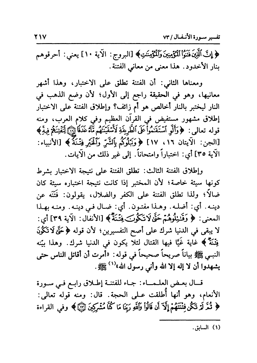 وإطلاق الفتنة الثالث: تطلق الفتنة على نتيجة الاختبار بِشَرْطِ كَوْنِهَا سَيِّئَة خاصَّة؛ لأن المختبر إذا كانت نتيجة اختباره سيئة كان ضالاًّ؛ ولذا تُطْلَقُ الفِتْنَة على الكفر والضلال، يقولون: فَتَنَه عن دينه؛ أي: أضَلَّهُ. وهذا مفتون؛ أي: ضال في دينه. ومنه بهذا المعنى: {وَقَاتِلُوهُمْ حَتَّى لَا تَكُونَ فِتْنَةٌ} [الأنفال: الآية ٣٩] أي: لا يَبْقَى فِي الدنيا شرك على أصح التفسيرين؛ لأن قوله: {حَتَّى لَا تَكُونَ فِتْنَةٌ} غاية غَيّا فيها القتال لِئَلاّ يكون في الدنيا شرك. وهذا بَيَّنَهُ النبي صلى الله عليه وسلم بياناً صريحاً صحيحاً في قوله: «أُمِرْتُ أَنْ أُقَاتِلَ النَّاسَ حَتَّى يَشْهَدُوا أَنْ لَا إِلَهَ إِلَاّ اللهُ وَأَنِّي رَسُولُ اللهِ» (¬١).