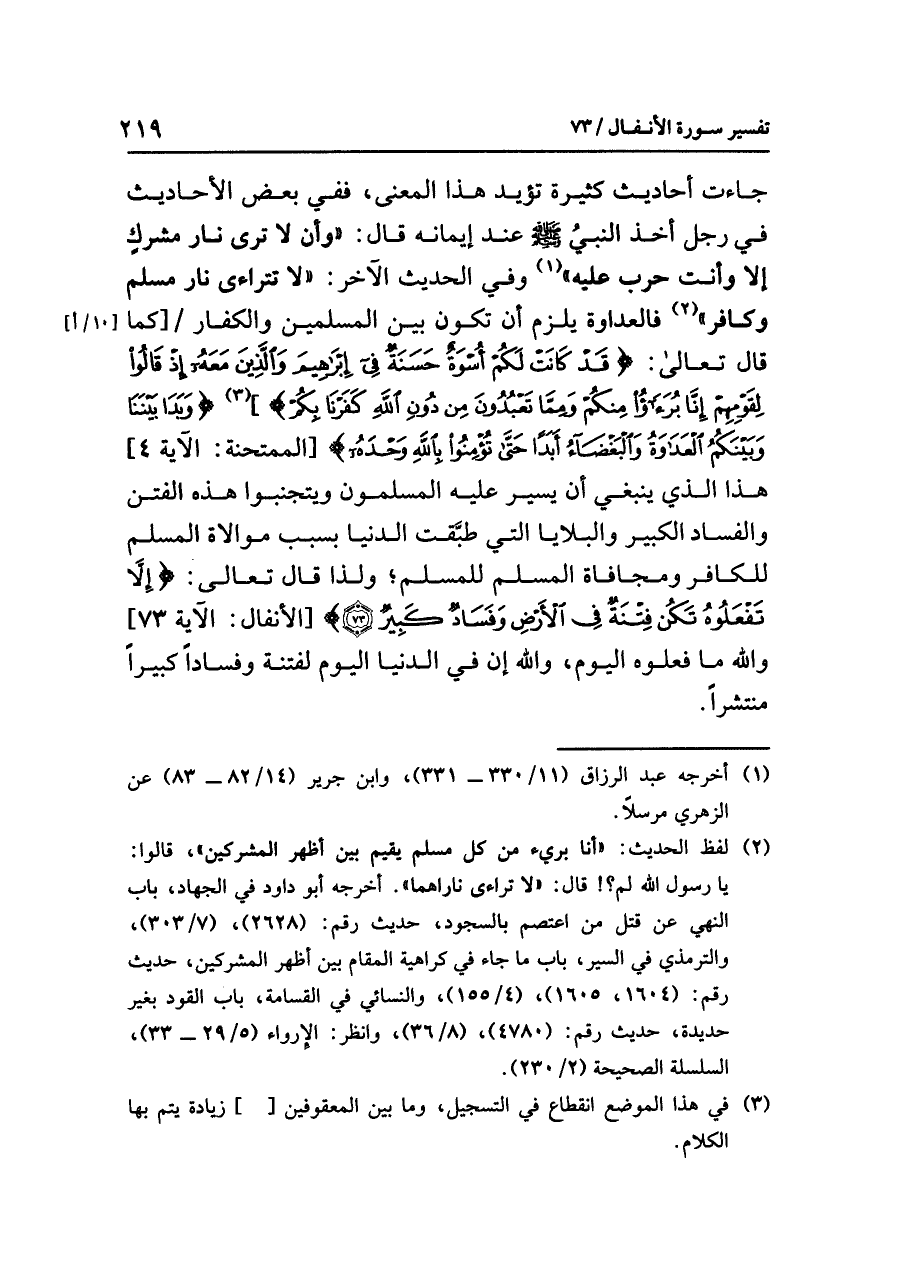 [١٠/أ] والكفار/ [كما قال تعالى: {قَدْ كَانَتْ لَكُمْ أُسْوَةٌ حَسَنَةٌ فِي إِبْرَاهِيمَ وَالَّذِينَ مَعَهُ إِذْ قَالُوا لِقَوْمِهِمْ إِنَّا بُرَءَاء مِنكُمْ وَمِمَّا تَعْبُدُونَ مِن دُونِ اللَّهِ كَفَرْنَا بِكُمْ}] (¬٣) {وَبَدَا بَيْنَنَا وَبَيْنَكُمُ الْعَدَاوَةُ وَالْبَغْضَاء أَبَداً حَتَّى تُؤْمِنُوا بِاللَّهِ وَحْدَهُ} [الممتحنة: الآية ٤] هذا الذي ينبغي أن يسير عليه المسلمون ويَتَجَنَّبُوا هَذِهِ الفِتَن والفَساد الكبير والبلايا التي طبَّقت الدنيا بسبب مُوَالَاةِ المُسْلِم للكافر ومجافَاة المسلم للمسلم؛ ولذا قال تعالى: {إِلَاّ تَفْعَلُوهُ تَكُن فِتْنَةٌ فِي الأَرْضِ وَفَسَادٌ كَبِير} [الأنفال: الآية ٧٣] والله ما فعلوه اليوم، والله إن في الدنيا اليوم لفتنة وفساداً كبيراً منتشراً.