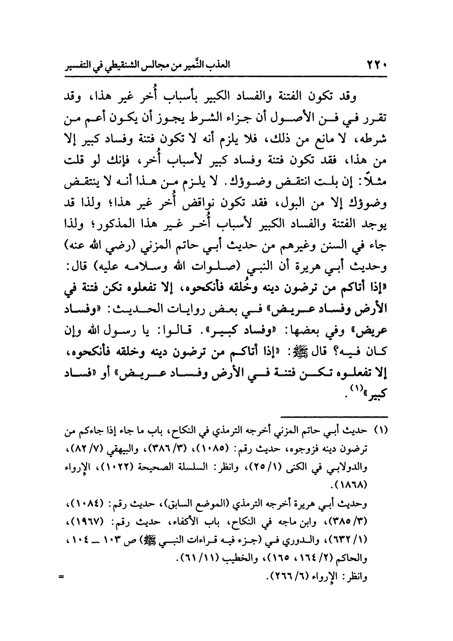 وقد تكون الفتنة والفساد الكبير بأسباب أُخَر غير هذا، وقد تَقَرَّرَ فِي فَنِّ الأصُول أن جزاء الشرط يجوز أن يكون أعَمّ مِنْ شَرْطِهِ، لا مانع من ذلك، فلا يلزم أنه لا تكون فتنة وفساد كبير إلا مِنْ هَذَا، فقد تكون فتنة وفساد كبير لأسباب أخر، فإنك لو قلت مثلاً: إن بلت انتقض وضُوؤك. لا يلزم من هذا أنه لا ينتقض وضوؤك إلا مِنَ الْبَوْلِ، فَقَدْ تَكُون نواقض أخر غير هذا؛ ولذا قد يوجد الفتنة والفساد الكبير لأسْبَابٍ أُخَر غير هذا المذكور؛ ولذا جاء في السنن وغيرها من حديث أبي حاتم المُزَنِيّ (رضي الله عنه) وحديث أبي هريرة أن النبي (صلوات الله وسلامه عليه) قال: «إذَا أَتَاكُمْ مَنْ تَرْضَوْنَ دِينَهُ وَخُلُقَهُ فَأَنْكِحُوهُ، إِلَاّ تَفْعَلُوهُ تَكُنْ فِتْنَةٌ فِي الأَرْضِ وَفَسَادٌ عَرِيضٌ» في بعض روايات الحديث: «وفَسَاد عَرِيض» وفي بعضها. «وفَسَاد كَبِير». قالوا: يا رَسُول الله وإن كان فيه؟ قال صلى الله عليه وسلم: «إذا أتَاكُمْ مَنْ تَرْضَوْنَ دِينَهُ وخُلُقَهُ فأنْكِحُوه إلا تَفْعَلُوهُ تَكُنْ فِتْنَةٌ فِي الأَرْضِ وفَسَادٌ عَرِيضٌ» أو «فَسَادٌ كَبِيرٌ» (¬١).