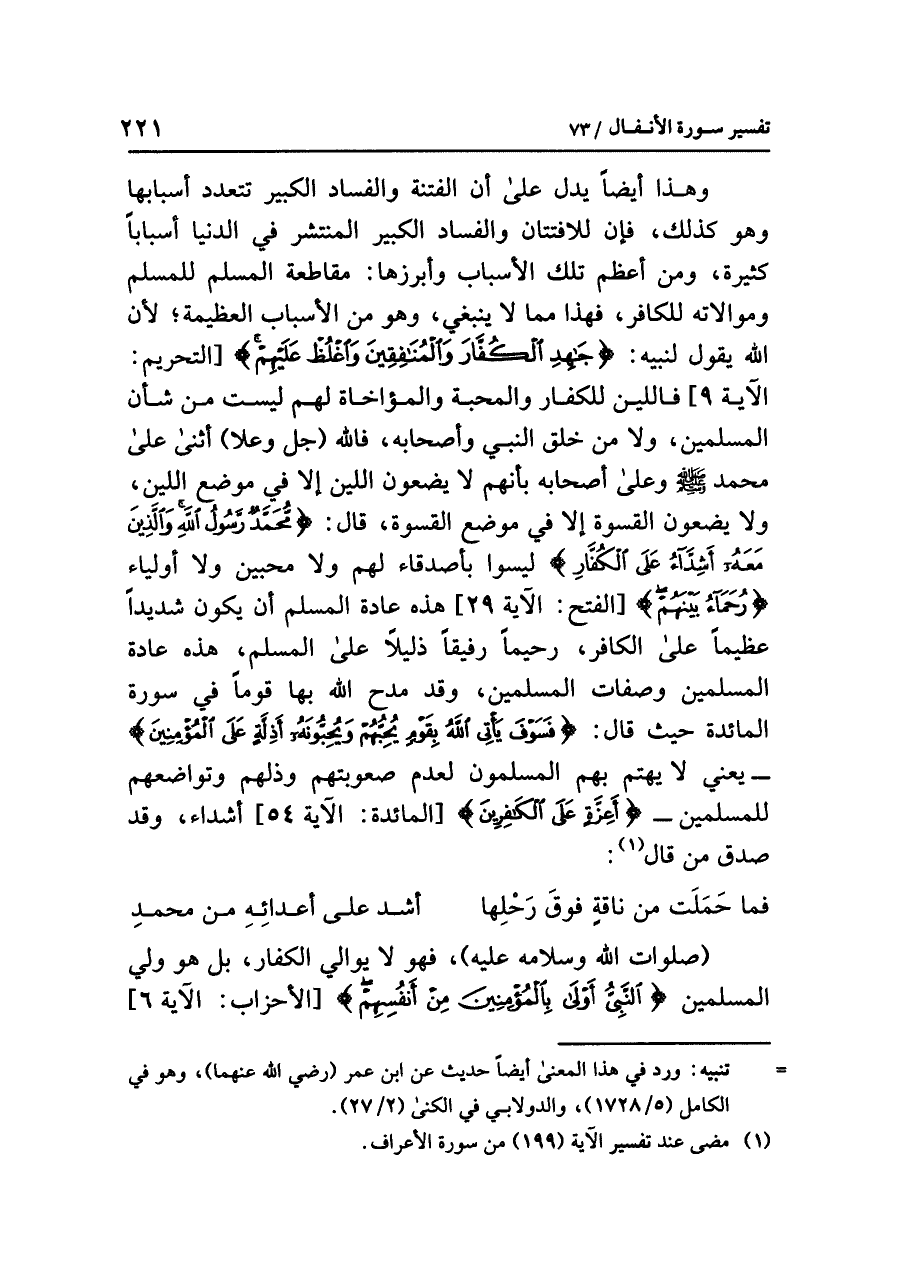 وهذا أيضاً يدل على أن الفتنة والفساد الكبير تتعدد أسبابها وهو كذلك، فإن للافتتان والفساد الكبير المنتشر في الدنيا أسباباً كثيرة، ومن أعظم تلك الأسباب وأبرزها: مقاطعة المسلم للمسلم وموالاته للكافر، فهذا مما لا ينبغي، وهو من الأسباب العظيمة؛ لأن الله يقول لنبيه: {جَاهِدِ الْكُفَّارَ وَالْمُنَافِقِينَ وَاغْلُظْ عَلَيْهِمْ} [التحريم: الآية ٩] فاللين للكفار والمحبة والمؤاخاة لهم ليست من شأن المسلمين، ولا مِنْ خُلُقِ النَّبِيِّ وأصحابه، فالله (جل وعلا) أثنى على محمد صلى الله عليه وسلم وعلى أصحابه بأنهم لا يضعون اللين إلا في موضع اللين، ولا يضعون القسوة إلا في موضع القسوة، قال: {مُّحَمَّدٌ رَّسُولُ اللَّهِ وَالَّذِينَ مَعَهُ أَشِدَّاء عَلَى الْكُفَّارِ} ليسوا بأصدقاء لهم ولا محبين ولا أولياء {رُحَمَاء بَيْنَهُمْ} [الفتح: الآية ٢٩] هذه عادة المسلم أن يكون شديداً عظيماً على الكافر، رحيماً رفيقاً ذليلاً على المسلم، هذه عادة المسلمين وصفات المسلمين، وقد مدح الله بها قوماً في سورة المائدة حيث قال: {فَسَوْفَ يَأْتِي اللَّهُ بِقَوْمٍ يُحِبُّهُمْ وَيُحِبُّونَهُ أَذِلَّةٍ عَلَى الْمُؤْمِنِينَ} -يعني لا يهتم بهم المسلمون لعدم صعوبتهم وذلهم وتواضعهم للمسلمين- {أَعِزَّةٍ عَلَى الْكَافِرِينَ} [المائدة: الآية ٥٤] أشداء، وقد صدق من قال (¬١):