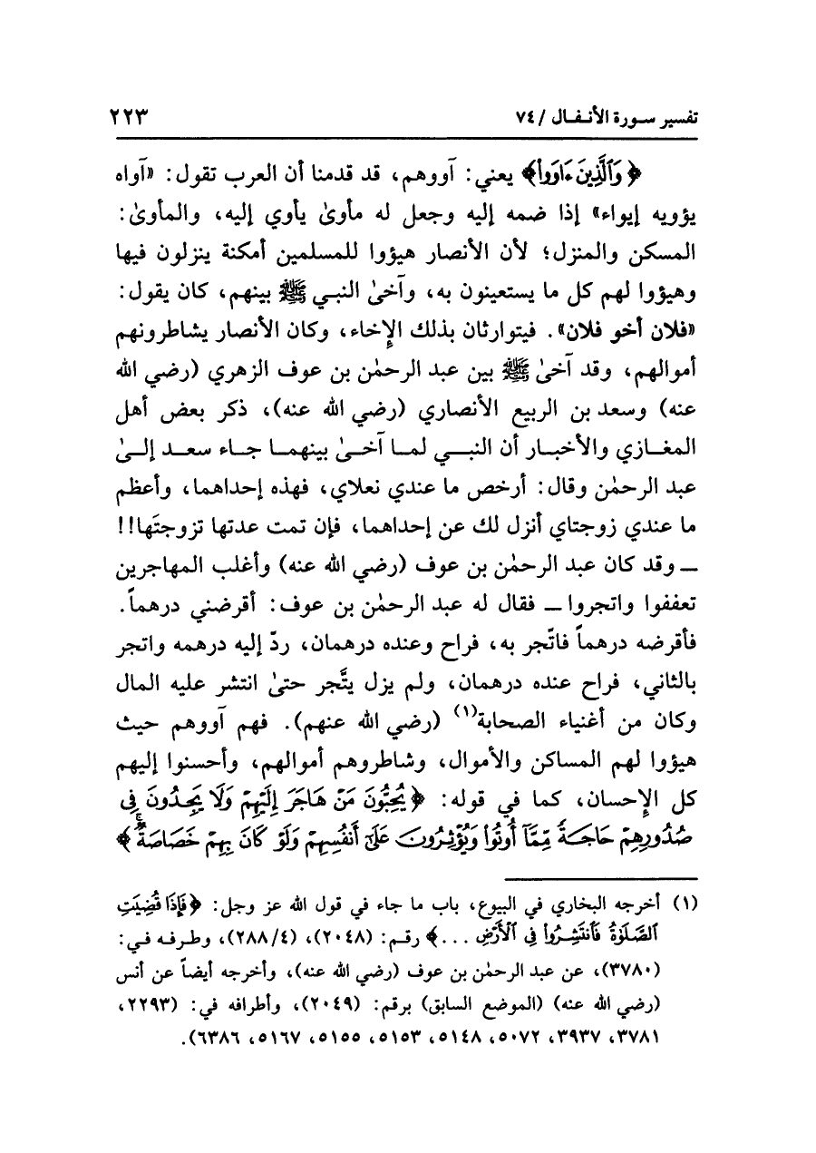 (¬١) أخرجه البخاري في البيوع، باب ما جاء في قول الله عز وحل: {فَإِذَا قُضِيَتِ الصَّلاةُ فَانتَشِرُوا فِي الأَرْضِ ... } رقم: (٢٠٤٨)، (٤/ ٢٨٨). وطرفه في (٣٧٨٠). عن عبد الرحمن بن عوف (رضي الله عنه). وأخرجه أيضاً عن أنس (رضي الله عنه) (الموضع السابق) برقم (٢٠٤٩). وأطرافه في: (٢٢٩٣، ٣٧٨١، ٣٩٣٧، ٥٠٧٢، ٥١٤٨، ٥١٥٣، ٥١٥٥، ٥١٦٧، ٦٣٨٦).