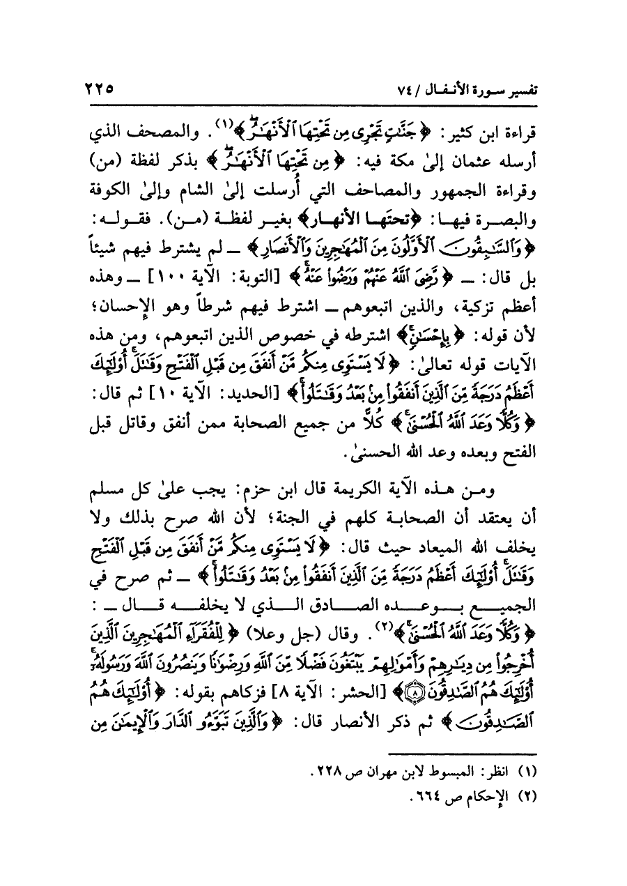 قراءة ابن كثير: {جَنَّاتٍ تَجْرِي تَحْتِهَا الأَنْهَارُ} (¬١) والمصحف الذي أرسله عثمان إلى مكة فيه: {من تَحْتِهَا الأَنْهَارُ} بذكر لفظة (من) وقراءة الجمهور والمصاحف التي أرسلت إلى الشام وإلى الكوفة والبصرة فيها: {تحتَها الأنهار} بغير لفظة (من). فقوله: {وَالسَّابِقُونَ الأَوَّلُونَ مِنَ الْمُهَاجِرِينَ وَالأَنصَارِ} -لم يشترط فيهم شيئاً، بل قال:- {رَّضِيَ اللَّهُ عَنْهُمْ وَرَضُواْ عَنْهُ} [التوبة: الآية ١٠٠]-وهذه أعظم تزكية، والذين اتبعوهم- اشترط فيهم شرطاً وهو الإحسان؛ لأن قوله: {بِإِحْسَانٍ} اشترطه في خصوص الذين اتبعوهم، ومن هذه الآيات قوله تعالى: {لَا يَسْتَوِي مِنكُم مَّنْ أَنفَقَ مِن قَبْلِ الْفَتْحِ وَقَاتَلَ أُوْلَئِكَ أَعْظَمُ دَرَجَةً مِّنَ الَّذِينَ أَنفَقُوا مِن بَعْدُ وَقَاتَلُوا} [الحديد: الآية ١٠] ثم قال: {وَكُلاًّ وَعَدَ اللَّهُ الْحُسْنَى} كلاًّ من جميع الصحابة ممن أنفق وقاتل قبل الفتح وبعده وعد الله الحسنى.