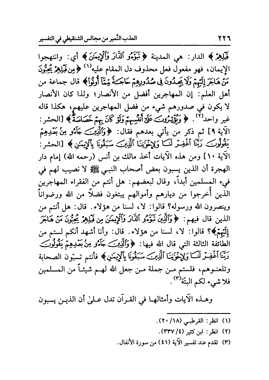 قَبْلِهِمْ} الدار: هي المدينة {تَبَوَّؤُوا الدَّارَ وَالإِيمَانَ} أي: وانتهجوا الإيمان، فهو مفعول فعل محذوف دل المقام عليه (¬١) {مِن قَبْلِهِمْ يُحِبُّونَ مَنْ هَاجَرَ إِلَيْهِمْ وَلا يَجِدُونَ فِي صُدُورِهِمْ حَاجَةً مِّمَّا أُوتُوا} قال جماعة من أهل العلم: إن المهاجرين أفضل من الأنصار؛ ولذا كان الأنصار لا يكون في صدورهم شيء من فضل المهاجرين عليهم، هكذا قاله غير واحد (¬٢). {وَيُؤْثِرُونَ عَلَى أَنفُسِهِمْ وَلَوْ كَانَ بِهِمْ خَصَاصَةٌ} [الحشر: الآية ٩] ثم ذكر من يأتي بعدهم، فقال: {وَالَّذِينَ جَاءُوا مِن بَعْدِهِمْ يَقُولُونَ رَبَّنَا اغْفِرْ لَنَا وَلإِخْوَانِنَا الَّذِينَ سَبَقُونَا بِالإِيمَانِ} [الحشر: الآية ١٠] ومن هذه الآيات أخذ مالك بن أنس (رحمه الله) إمام دار الهجرة أن الذين يسبون بعض أصحاب النبي صلى الله عليه وسلم لا نصيب لهم في فَيْءِ المسلمين أبداً، وقال لبعضهم: هل أنتم من الفقراء المهاجرين الذين أُخْرِجُوا مِنْ دِيَارِهِمْ وأمْوَالِهِمْ يَبْتَغُونَ فَضْلاً من الله ورضواناً وينصرون الله ورسوله؟ قالوا: لا، لسنا من هؤلاء.