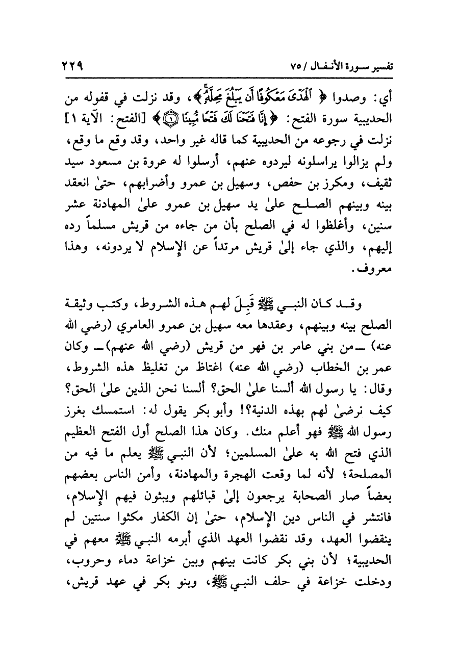أي: وصدوا الهدي مَعْكُوفاً أن يَبْلُغَ مَحله، وقد نزلت في قفوله من الحديبية سورة الفتح: {إِنَّا فَتَحْنَا لَكَ فَتْحاً مُّبِيناً (١)} [الفتح: الآية ١] نزلت في رجوعه من الحديبية كما قاله غير واحد، وقد وقع ما وقع، ولم يزالوا يراسلونه ليردوه عنهم، أرسلوا له عروة بن مسعود سيد ثقيف، ومكرز بن حفص، وسهيل بن عمرو وأضرابهم، حتى انعقد بينه وبينهم الصلح على يد سُهَيْلِ بن عَمْرو على المهادنة عشر سنين، وأغلظوا له في الصلح بأَنَّ مَنْ جَاءَهُ مِنْ قُرَيْش مسلماً رده إليهم، والذي جاء إلى قريش مرتدّاً عن الإسلام لا يردونه، وهذا معروف.